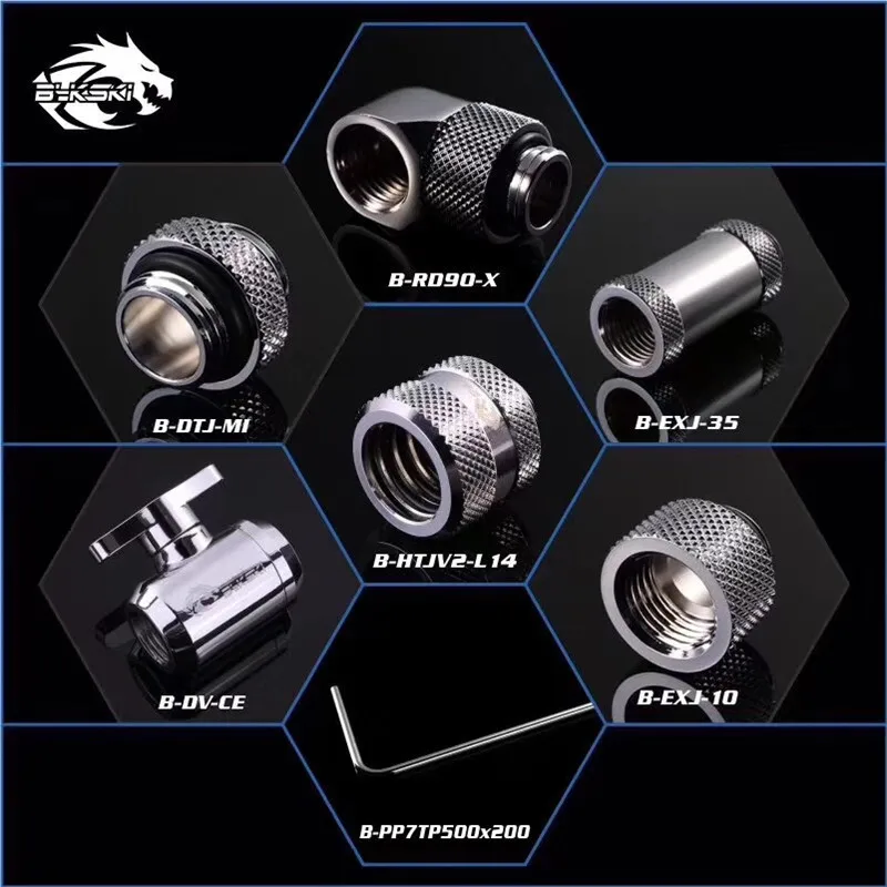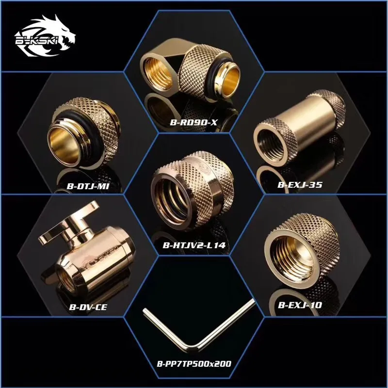 Фитинг для водяного охлаждения Bykski, жесткий фитинг для труб, компрессионный комплект, клапан + Угловой 90 + удлинители + металлическая жесткая труба 7 в 1