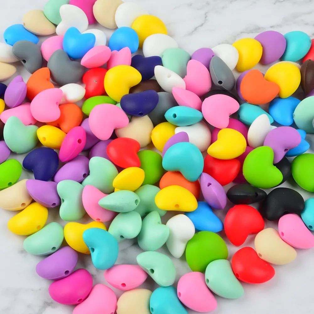 -Silicone beads Heart- Packing: 50pcs/lot Colors: 16 colors Size: 20*17*13mm Material: 1.100% food grade silicone 2.BPA free 3.NO Phthalate 4. No leadership 5.PVC free -All products are free of BPA, phthalates, lead and PVC. If you need a certificate, please contact us and leave your email message. -New products should be washed with warm water before use, can be used after cooling, and should be cleaned after each use. -Easy to clean. It is recommended to disinfect the pacifier wipes. -Please wash before use, please do not put the product on unsupervised children!