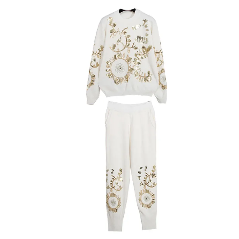 Осенний свободный белый вязаный спортивный костюм с блестками, женс...