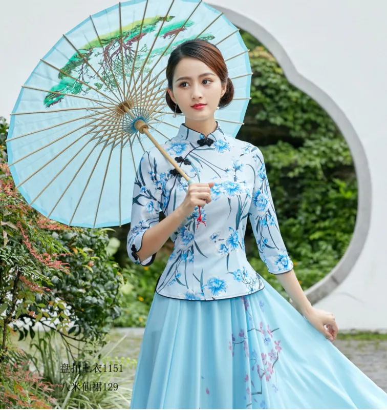 Женская рубашка с длинным рукавом Sheng Coco, Элегантная блузка Ципао в традиционном китайском стиле, 4XL, королевский синий, с китайским принтом