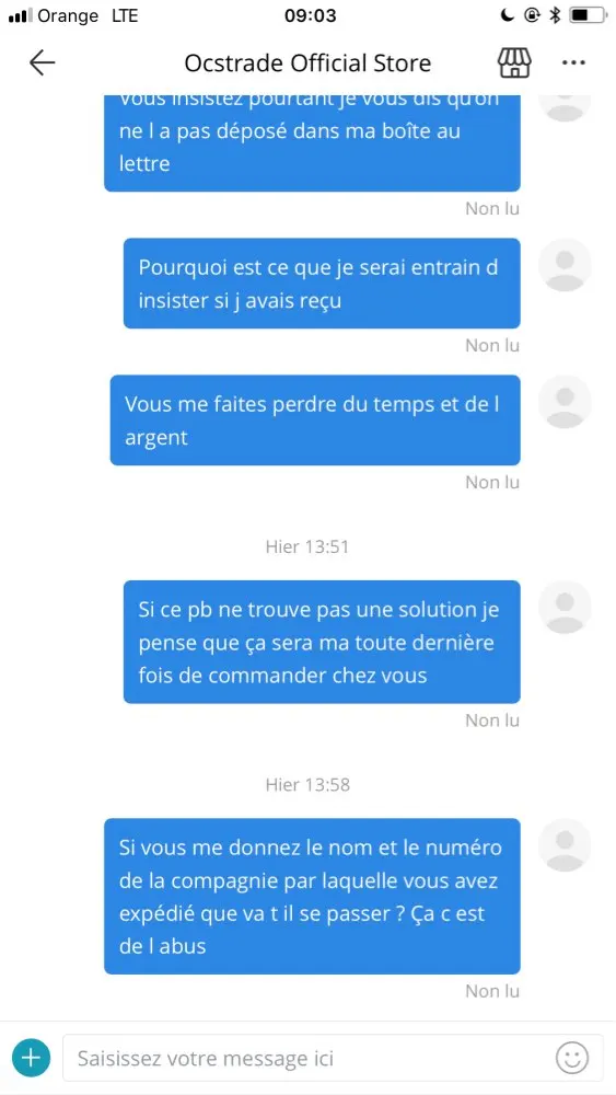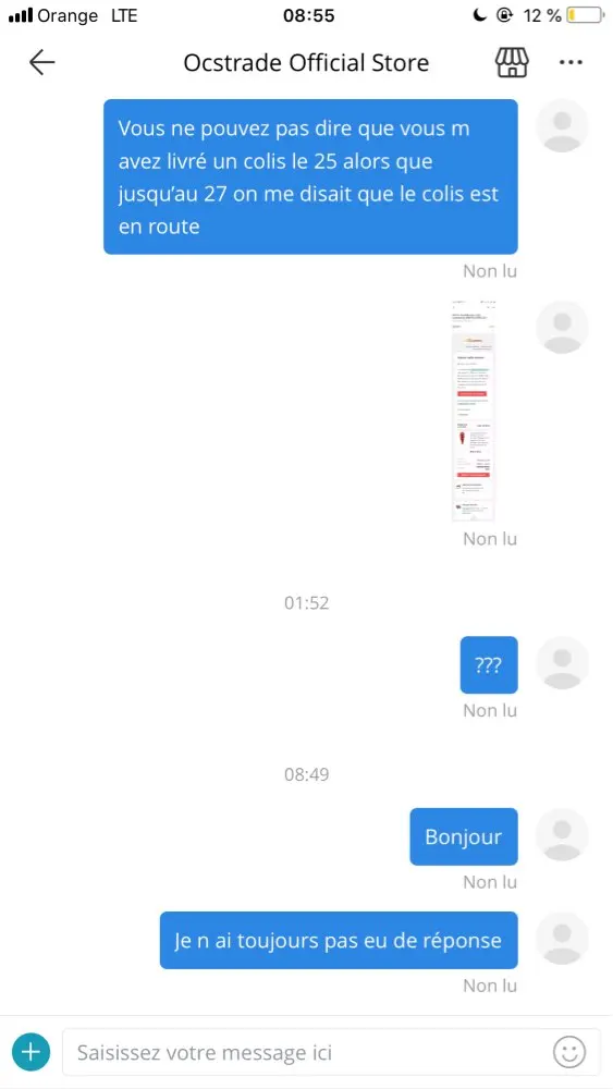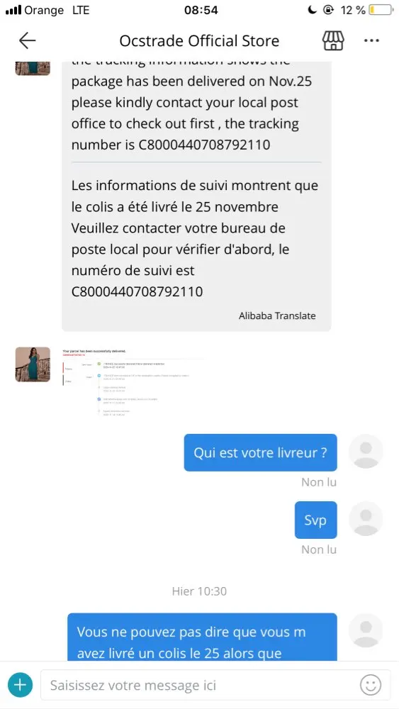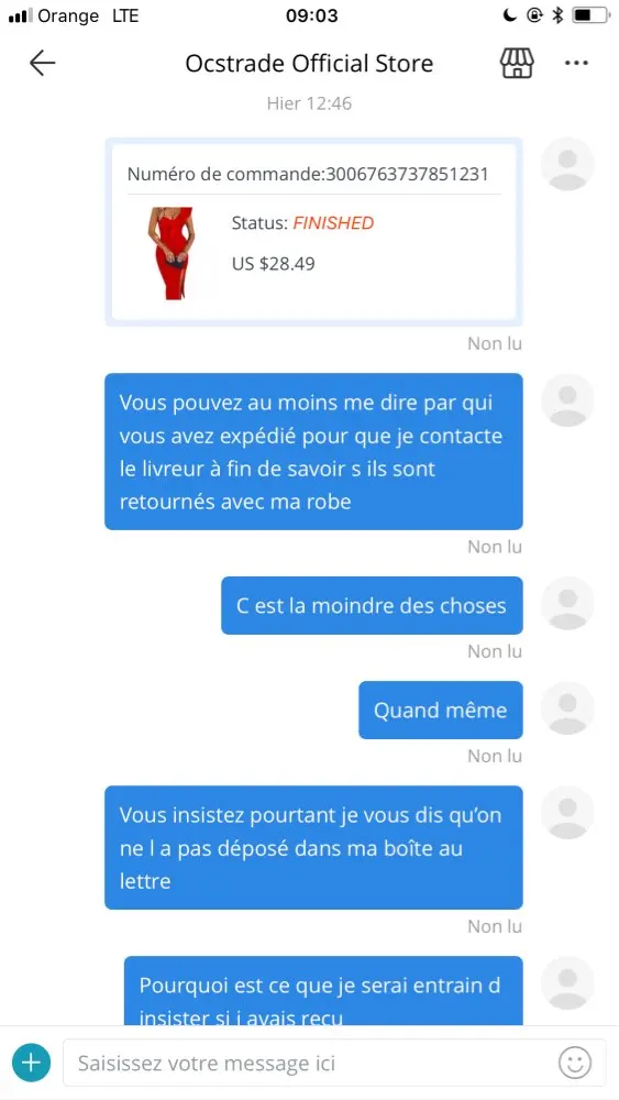 Я никогда не получил платье, мне писали, что оно было доставлено 25 и до 27 октября я получил уведомления, указав, что оно находится в процессе доставки. Когда я напишу продавцу, чтобы узнать, где находится моя посылка, он отправил меня обратно к продавцу доставки. Ответственность клиента состоит в том, чтобы оплатить и в случае недоставки это продавец, который управляется со своими поставителями. Я даже не знаю, какой поставщик несет ответственность за доставку посылки. И когда я напишу, мне никто не ответит. Я бы хотел получить деньги или платье.