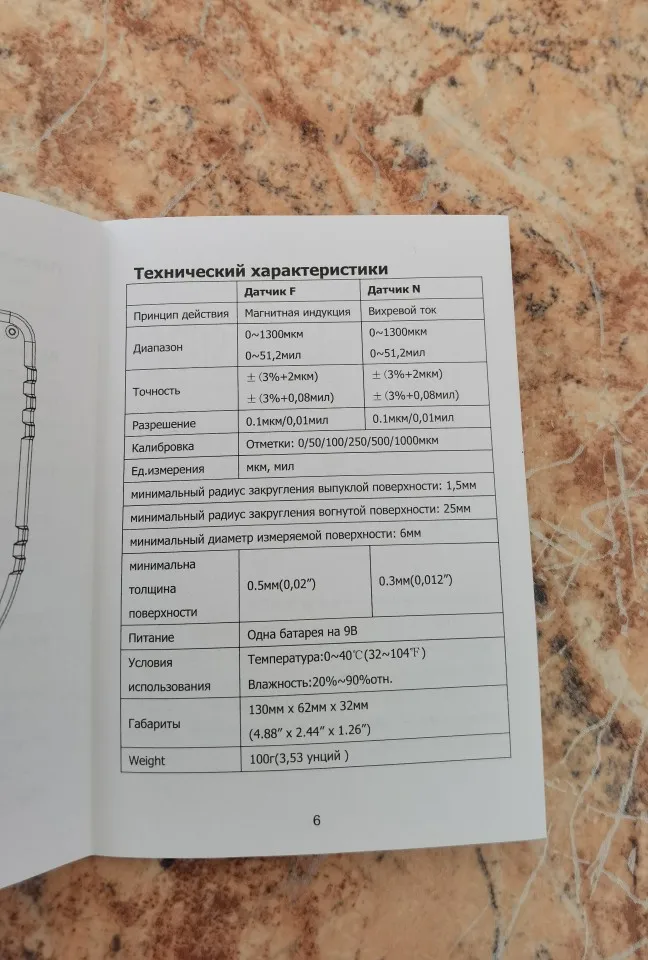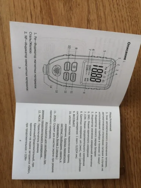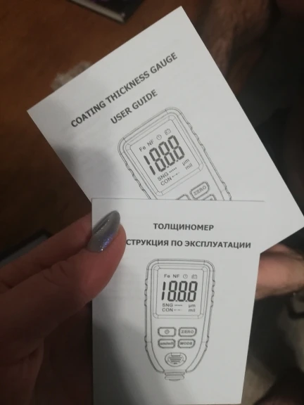 Отличный прибор, инструкция на русском языке имеется, батареи нет в комплекте,приобрёл заранее, включил откалибровал, на алюминиевой и стальной пластине, показания проверил на плёнках, что прилагались в комплекте, все четко, размер толщиномера такой не мелкий, сделан очень добротно, не кажется дешёвой игрушкой, вообщем очень доволен приобретением за 2400р.