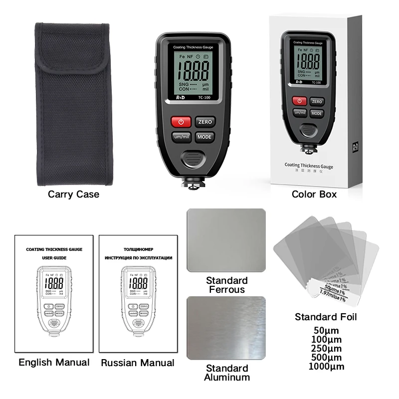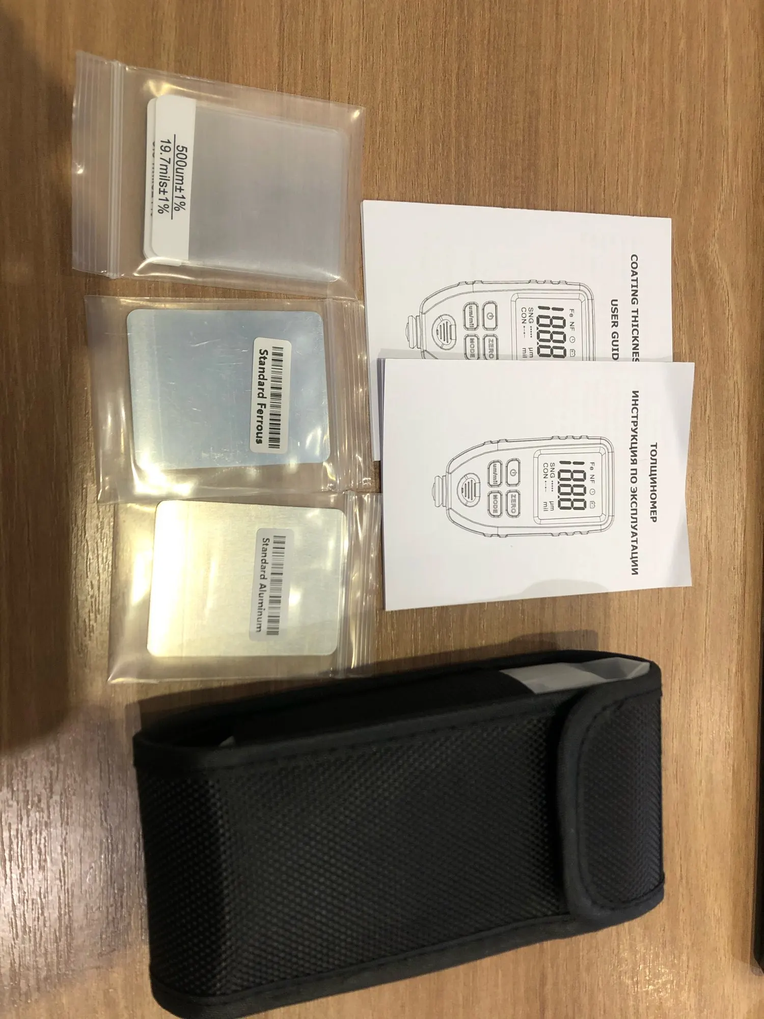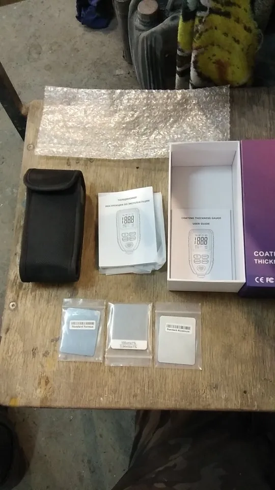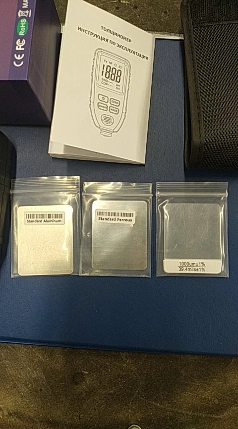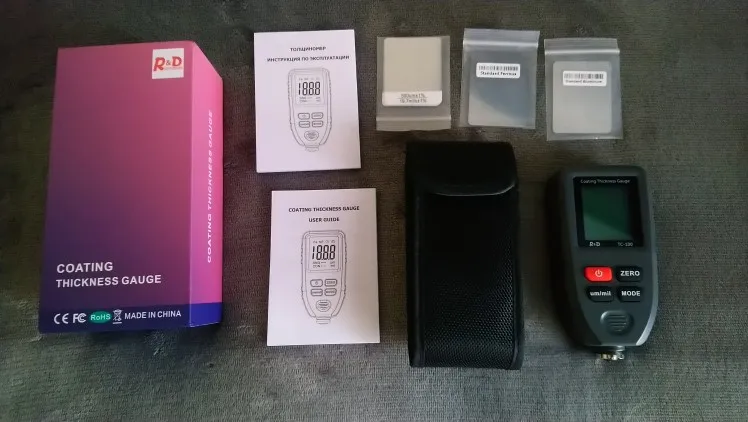 отличный толщинометр. в комплекте чехол, комплект пластин и пленок для колибровки и инструкция на англ и русском языке. прибор приехал откалиброванный. просто достал из коробки вставил крону и в бой... рекомендую!