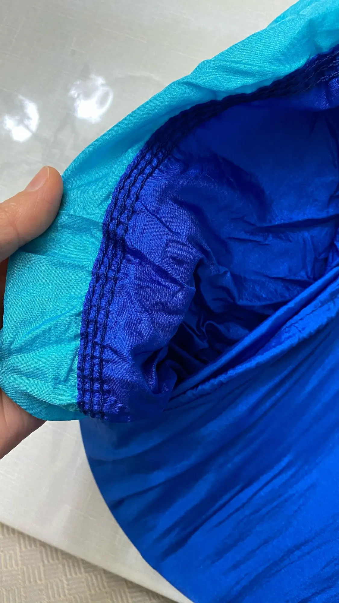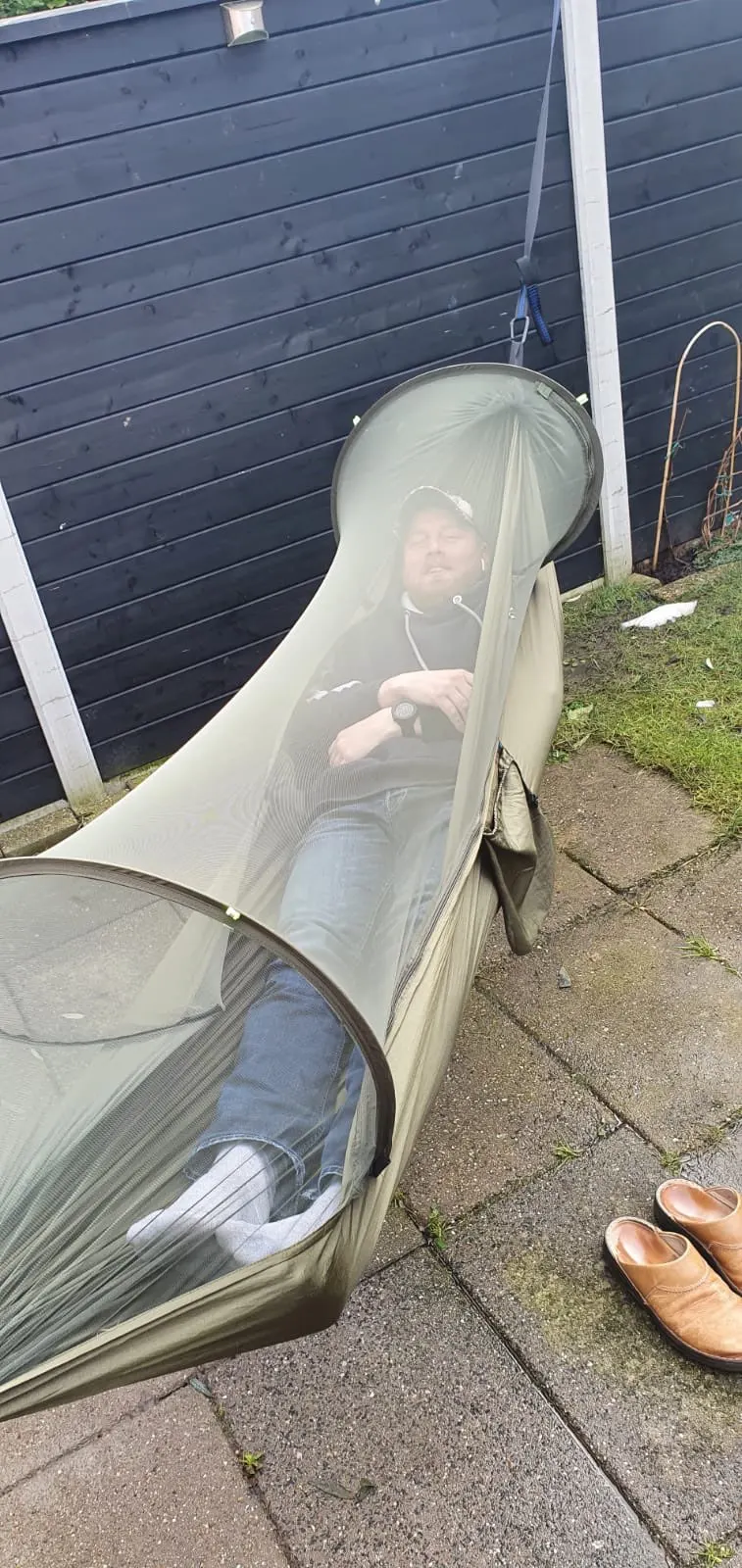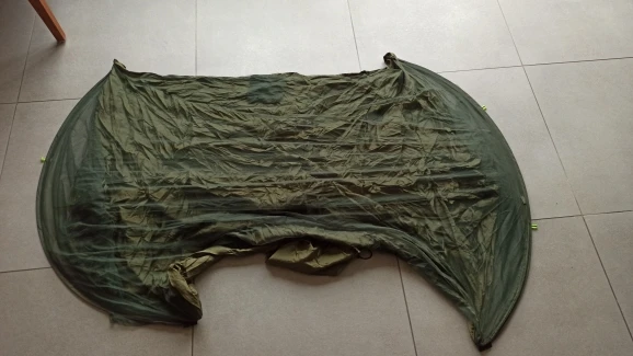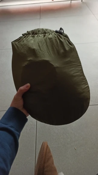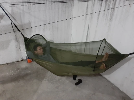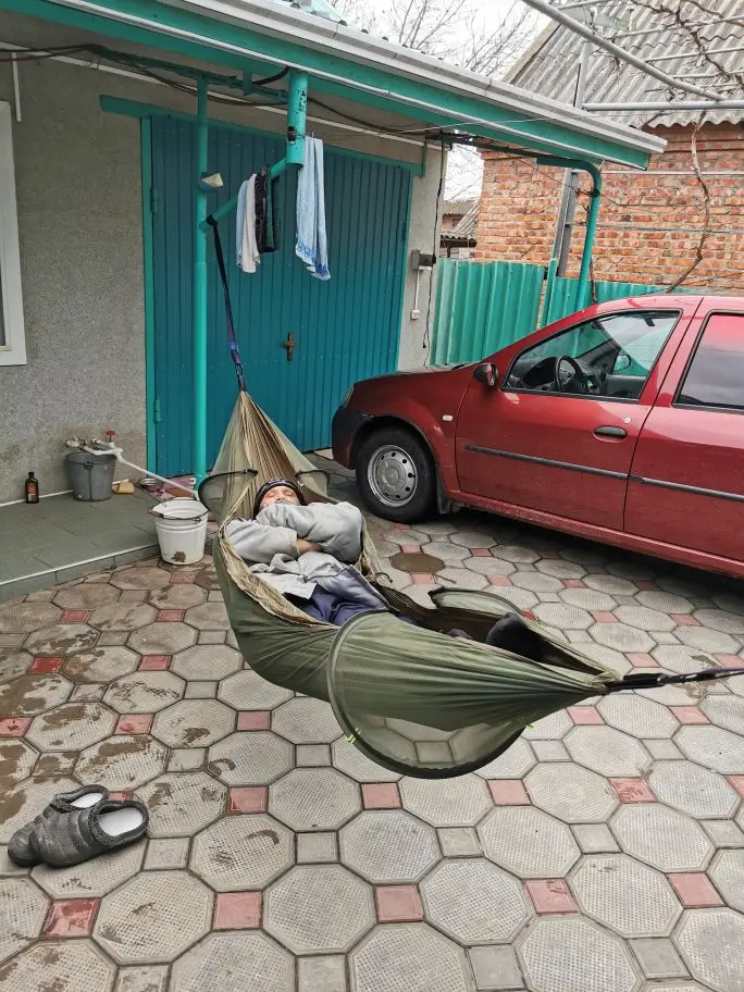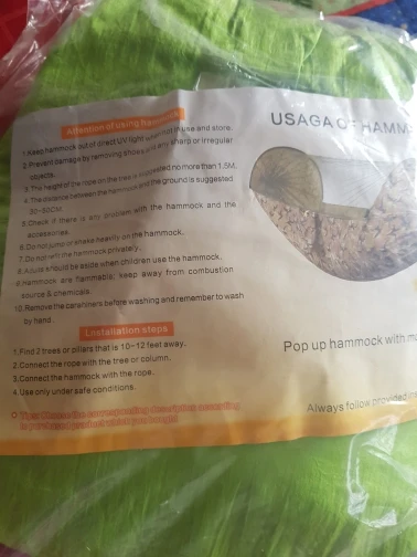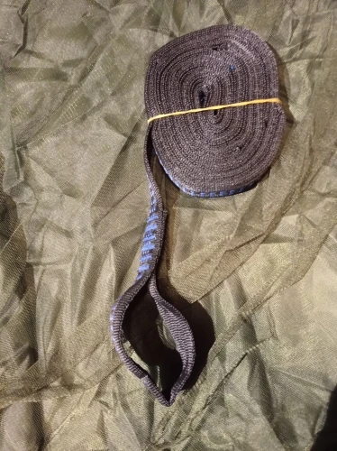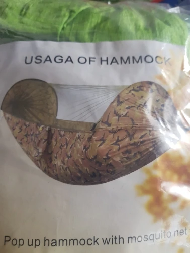 Мой рост 192см, умещаюсь в гамаке почти впритык по длине. Сетка провисает в середине, необходимы оттяжки для дуг с обеих сторон. Специально заказывал не яркий цвет, но кто-то из китайцев догадался на гамак защитной окраски пришить петли для оттяжки яркозеленого цвета.
