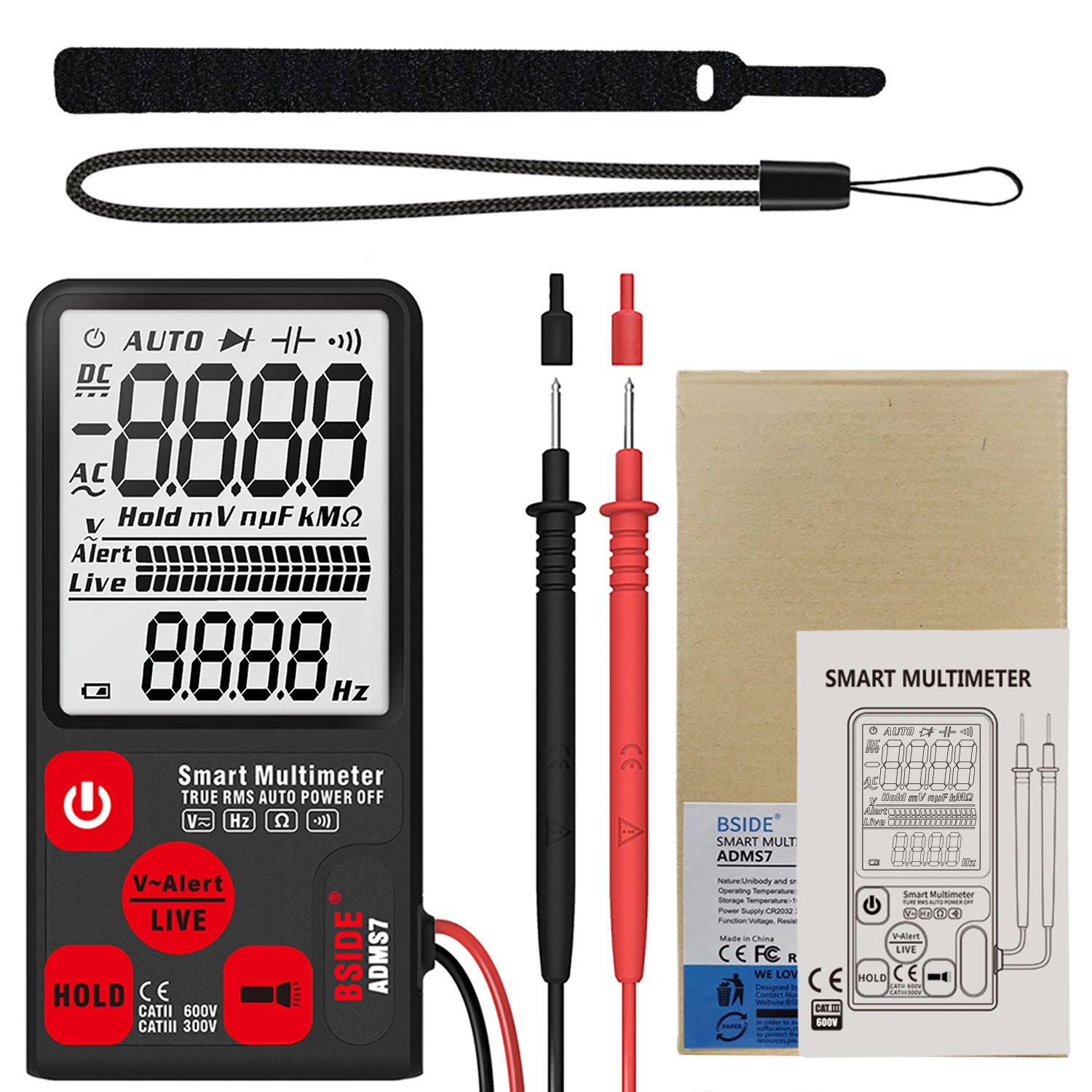1 * Умный Цифровой мультиметр напряжения 1 * Тесты свинца 2*3 В (CR2032) 1 * Высококачественный нейлоновый ремешок 1 * Многоразовые ремни 1 * Руководство пользователя