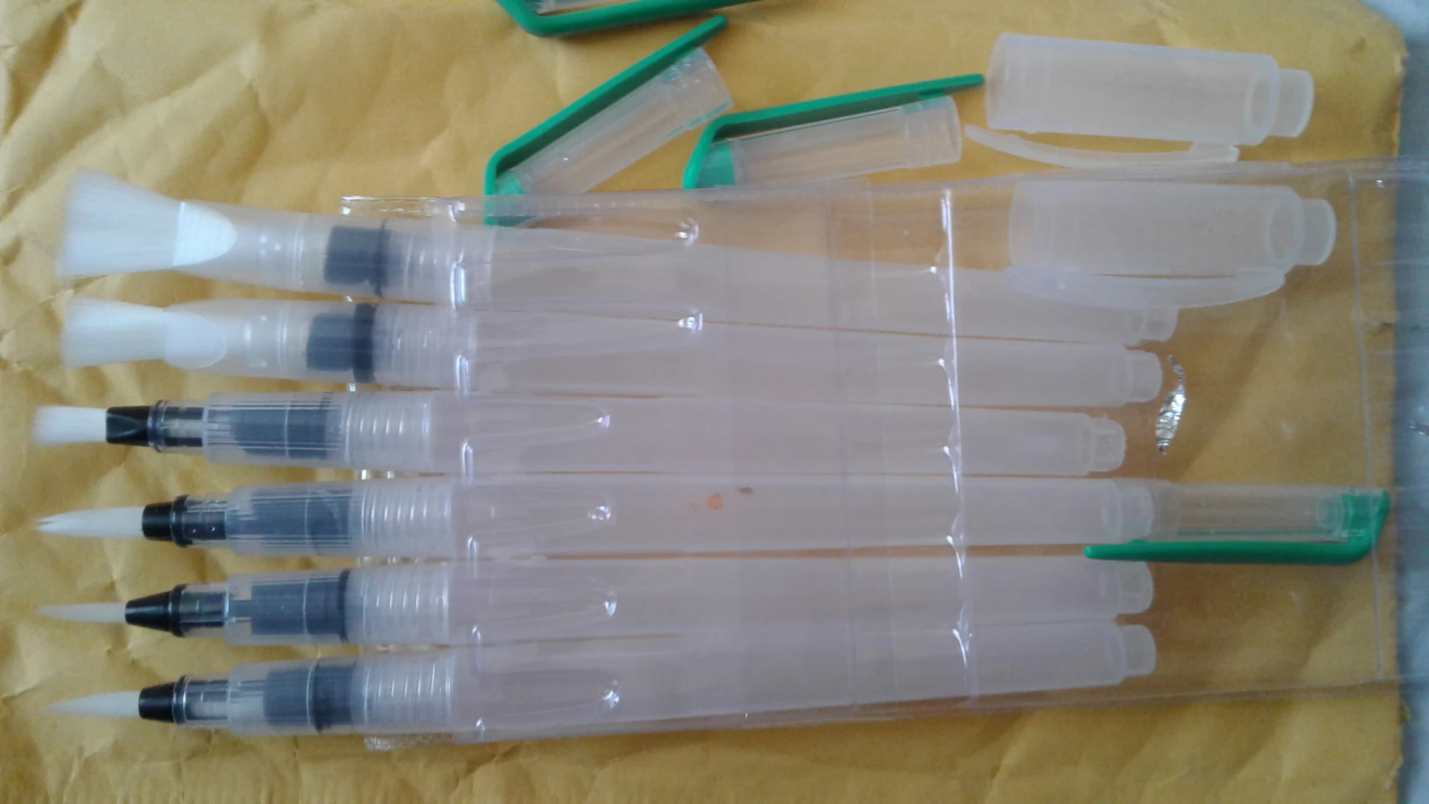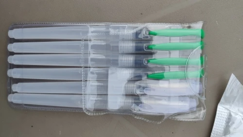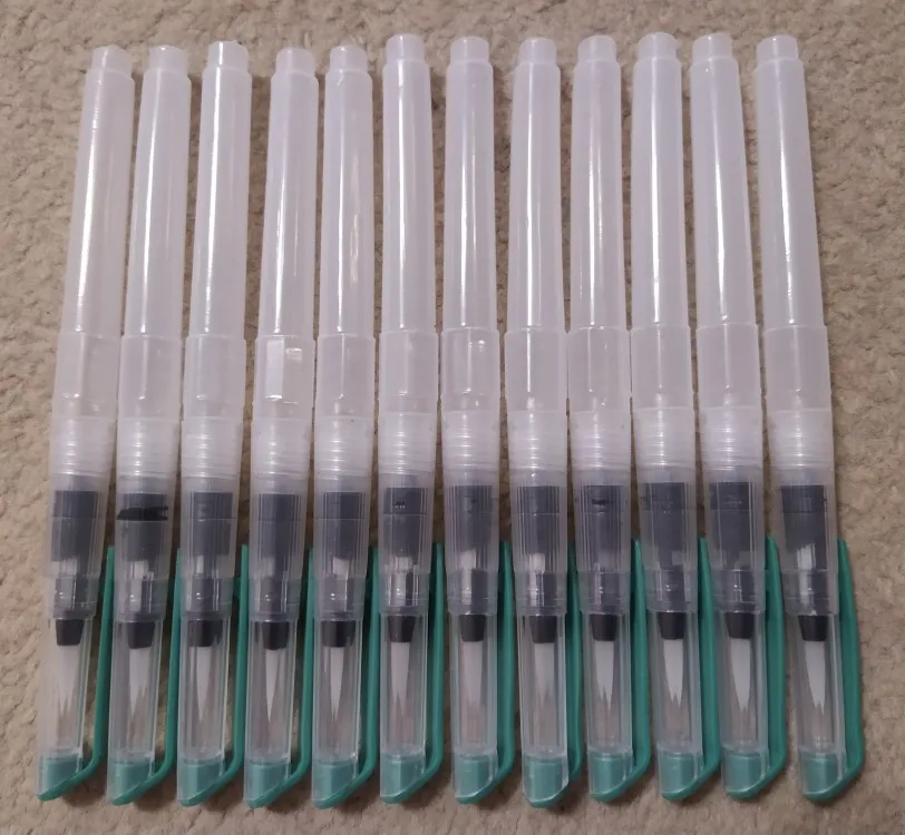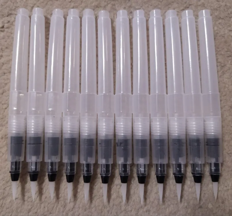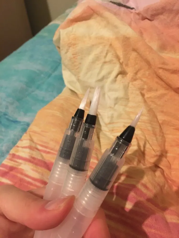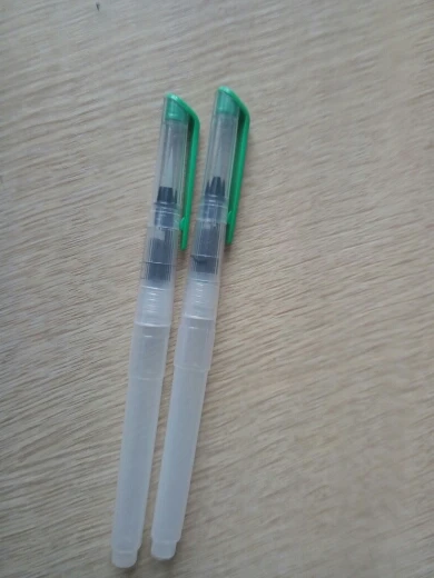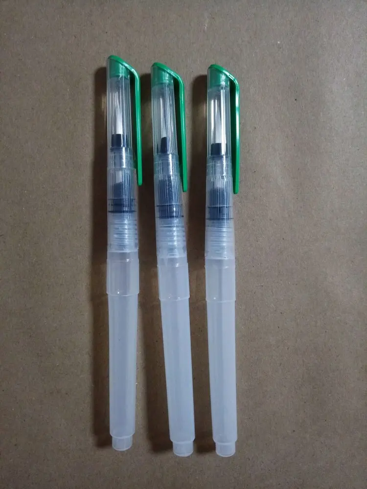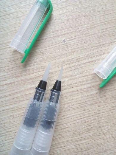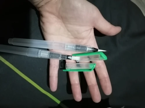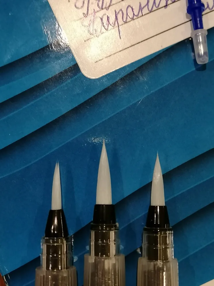 Товар пришёл где-то за 2 недели до Москвы. Брала комплект из 3 кисточек с тонким наконечником, т.к. уже есть одна с толстым. В целом товар такой, как я ожидала. Вода не вытекает, поступление идёт хорошо, красит неплохо как акварель так и акварельные карандаши. Нужно только научиться пользоваться аквабрашем :). Единственное: у одной кисточки торчал длинный ворс, но я его смогла отдернуть, а у другой сама кисть разделена (на фото видно). После воды, надеюсь, станет единым и тонким. Кисть уже не белая, потому что подработала ею, но это проблема всех аквабрашей. Не всегда даже тщательное мытьё спасает. У кисточек есть одна особенность: резервуар откручивается в другую сторону. Это выглядит странно, но привыкаешь. С продавцом не общалась. Товар порекомендовать могу, как «походный вариант» пойдёт отлично, да и если хочется попробовать.