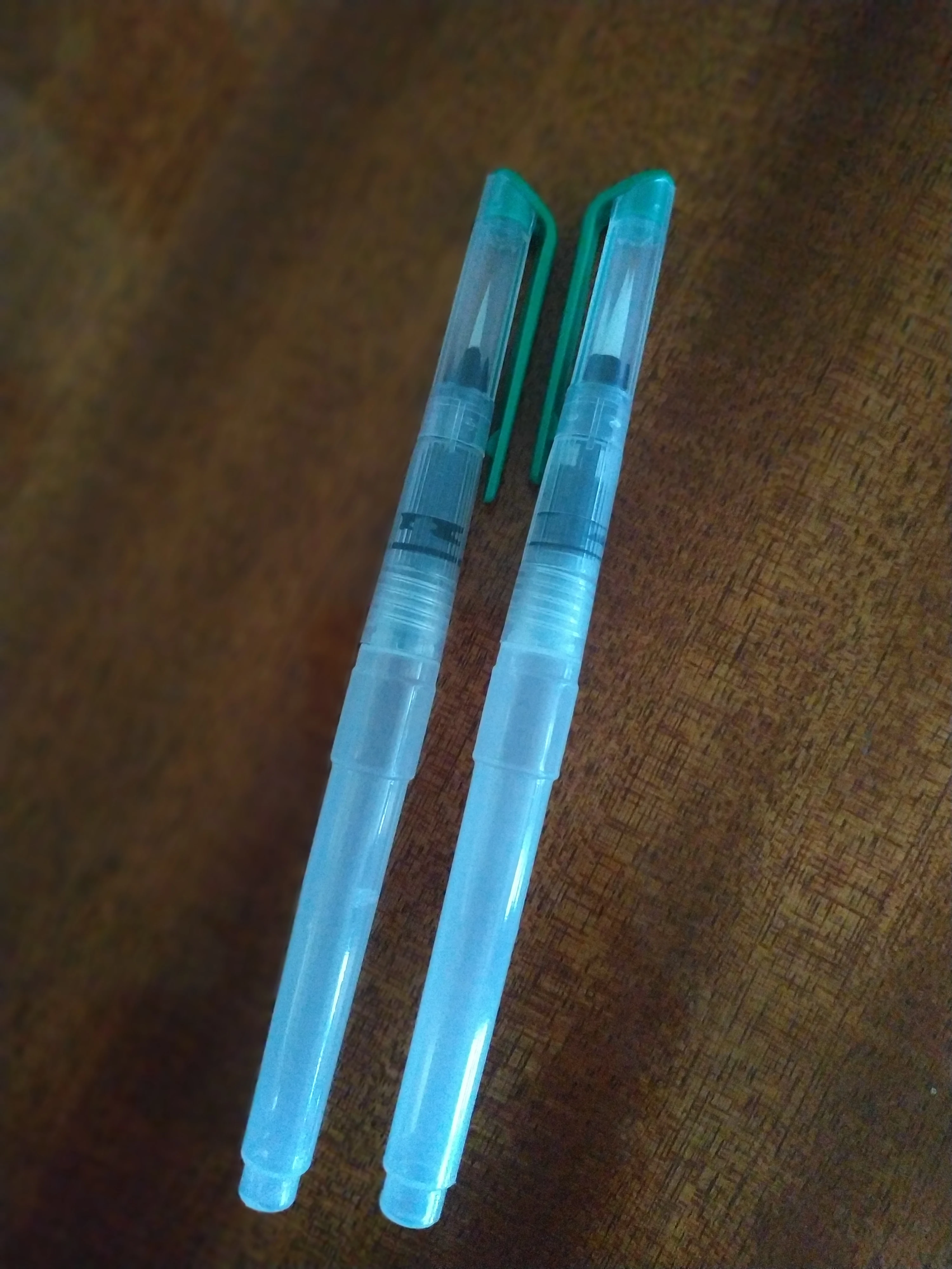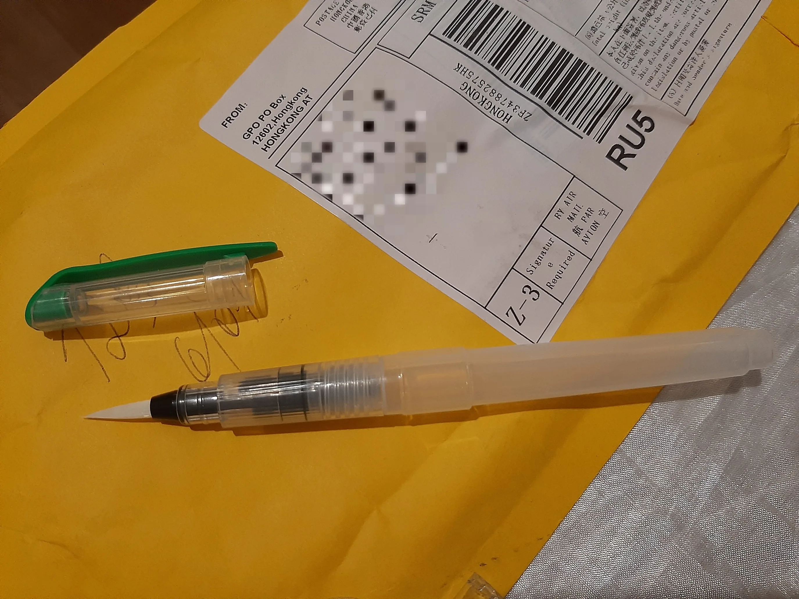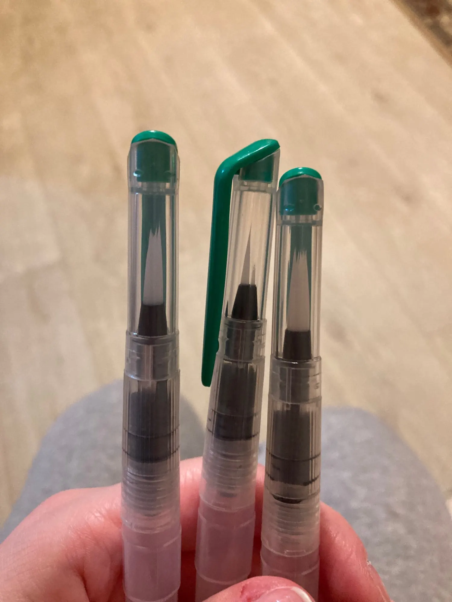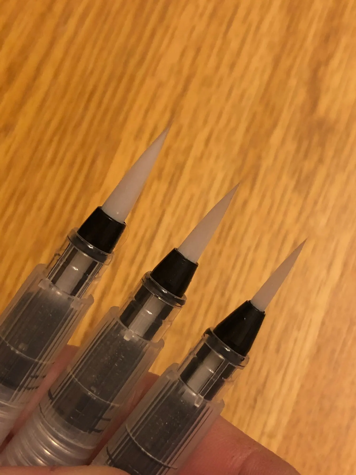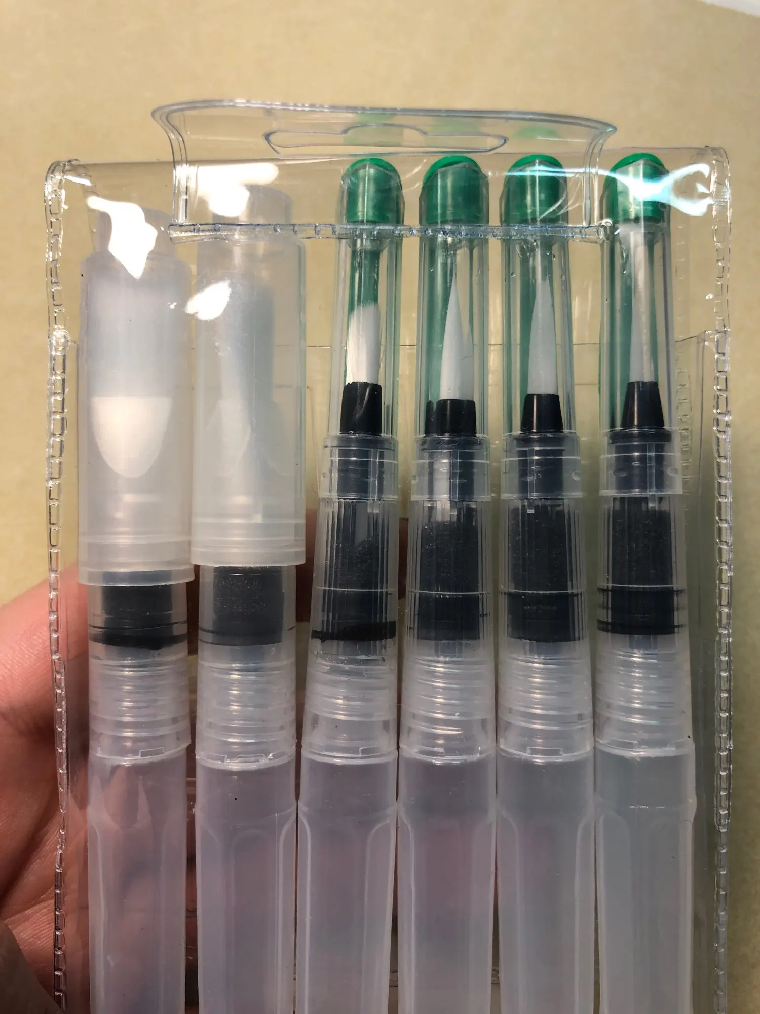 Товар пришёл где-то за 2 недели до Москвы. Брала комплект из 3 кисточек с тонким наконечником, т.к. уже есть одна с толстым. В целом товар такой, как я ожидала. Вода не вытекает, поступление идёт хорошо, красит неплохо как акварель так и акварельные карандаши. Нужно только научиться пользоваться аквабрашем :). Единственное: у одной кисточки торчал длинный ворс, но я его смогла отдернуть, а у другой сама кисть разделена (на фото видно). После воды, надеюсь, станет единым и тонким. Кисть уже не белая, потому что подработала ею, но это проблема всех аквабрашей. Не всегда даже тщательное мытьё спасает. У кисточек есть одна особенность: резервуар откручивается в другую сторону. Это выглядит странно, но привыкаешь. С продавцом не общалась. Товар порекомендовать могу, как «походный вариант» пойдёт отлично, да и если хочется попробовать.