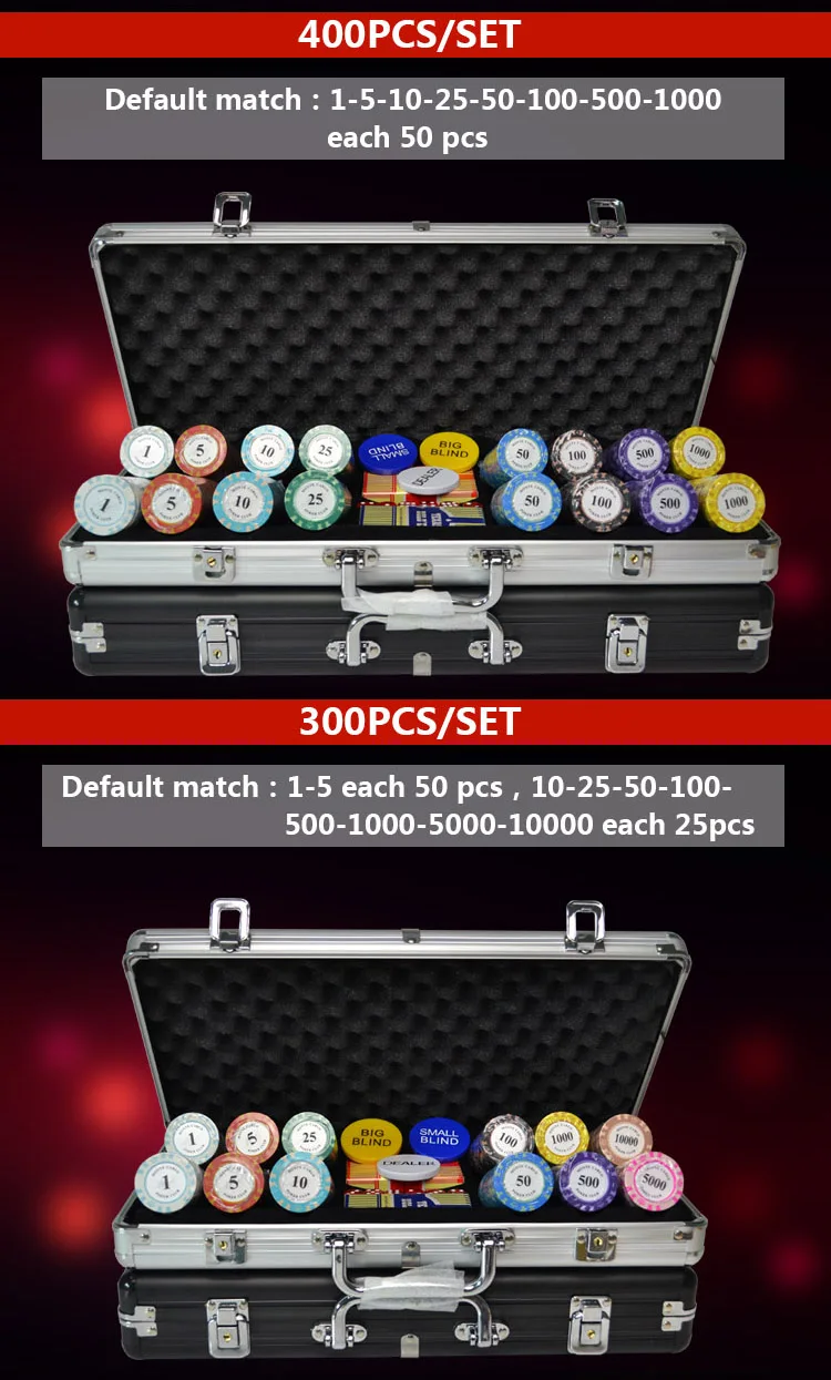 100-500 шт.компл. наборы чипов для Покера из глины, казино Texas Pokers, алюминиевый чемодан с игральными картами, кубиками и кнопками дилера
