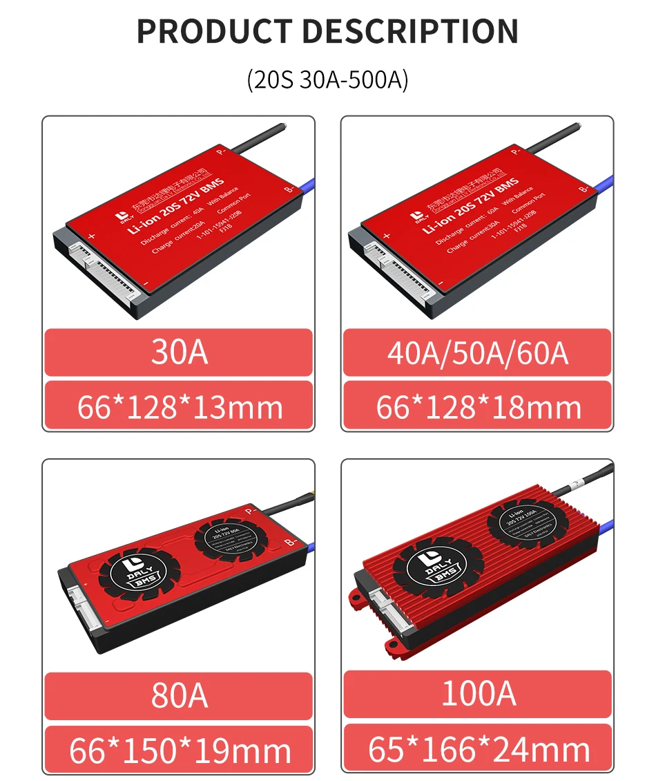 300А батарея BMS зарядное напряжение 54,6 вМодель: DL20S (3,7 В Номинальная Li-Ion Батарея не для 3,2 В Номинальная LiFePO4)Общая версия: общий порт для зарядки/разрядкиОтдельная версия: отдельный порт для зарядки/разрядкиМы можем настроить любой PCB от 1S до 30S литиевых батарей с разным током. 1. Обзор◆DL 20 S 72V 30A 40A 50A 60A bms используется для 20 серий 72В аккумуляторной батареи.◆Мы можем спроектировать его для различных литиевых батарей, таких как LiFepo4, LiMn2O4, Li-polymer и т. д.◆Основные функции: защита от перезарядки, защита от разрядки, защита от перегрузки по току, защита от короткого замыкания, защита от температуры и т. д.◆В соответствии с запросом клиента мы можем разработать PCM различных размеров и конструкций.◆BMS изготовлено высококачественными Mos и IC импортированными. Храните аккумулятор в течение длительного цикла. 2. Преимущество◆Используйте высококачественный (A-level) защитный интегральный замыкание IC, от решения Seiko из Японии.◆Сильная способность нагрузки, постоянная разрядка тока 30A 40A 50A 60A, использование высокого напряжения сопротивления, низкое внутреннееСопротивление мощности Mosfet. Теплоотвод значительно поможет охлаждению.Сам ◆IC имеет функцию балансировки мощности. Схема проста и надежна.◆Типичное Обнаружение напряжения для каждой ячейки. Таким образом, каждый аккумулятор будет предотвращен из-за заряда или разрядки. Функция защиты от перегрузки по току и короткого замыкания очень надежная. Долгое время короткого замыкания нагрузки не повлияет на печатную плату и батарею. Защита от температуры во время зарядки и разрядки.◆Extreme низкая потребеление энергии. Потребление всего устройства составляет менее 50uA.◆PCB использует высокие антикоррозийные, Высокая водонепроницаемость, высокое сопротивление ОУР Формальное покрытие.