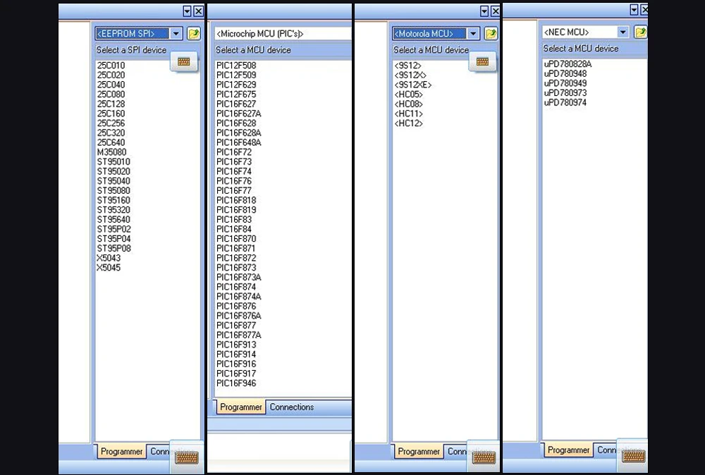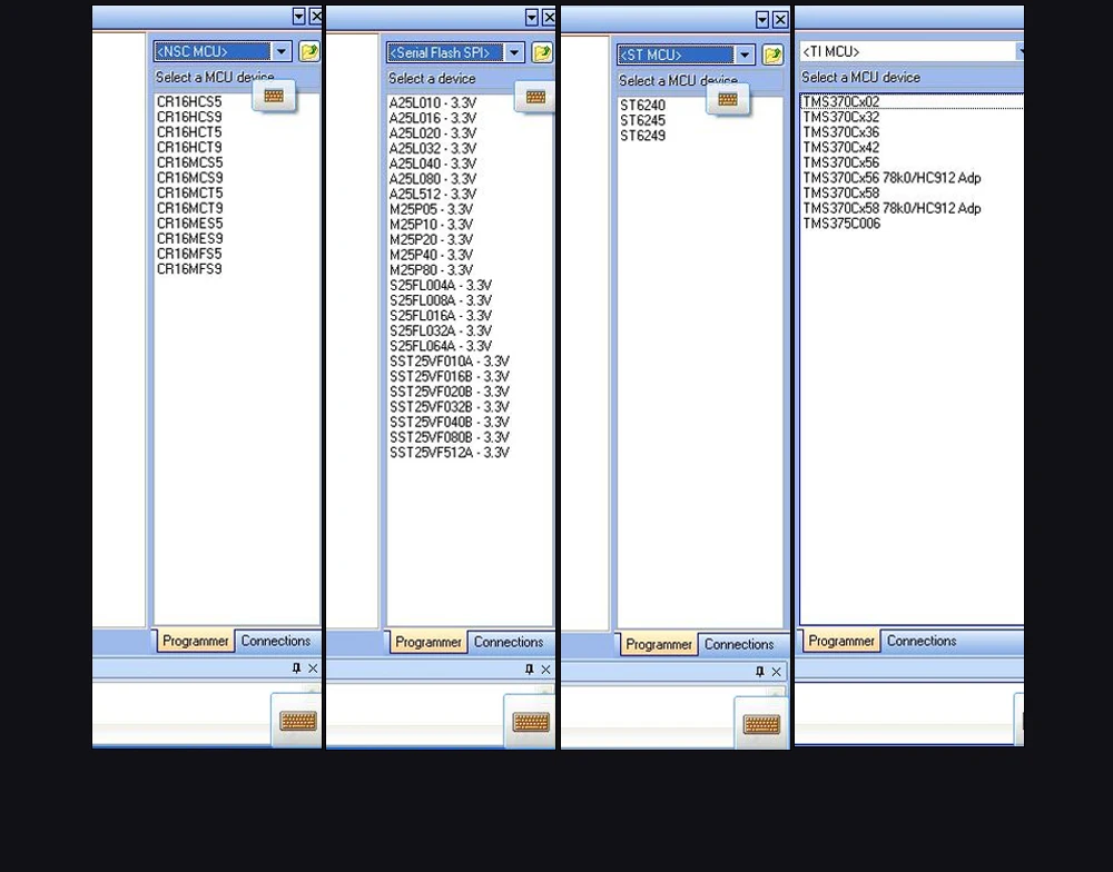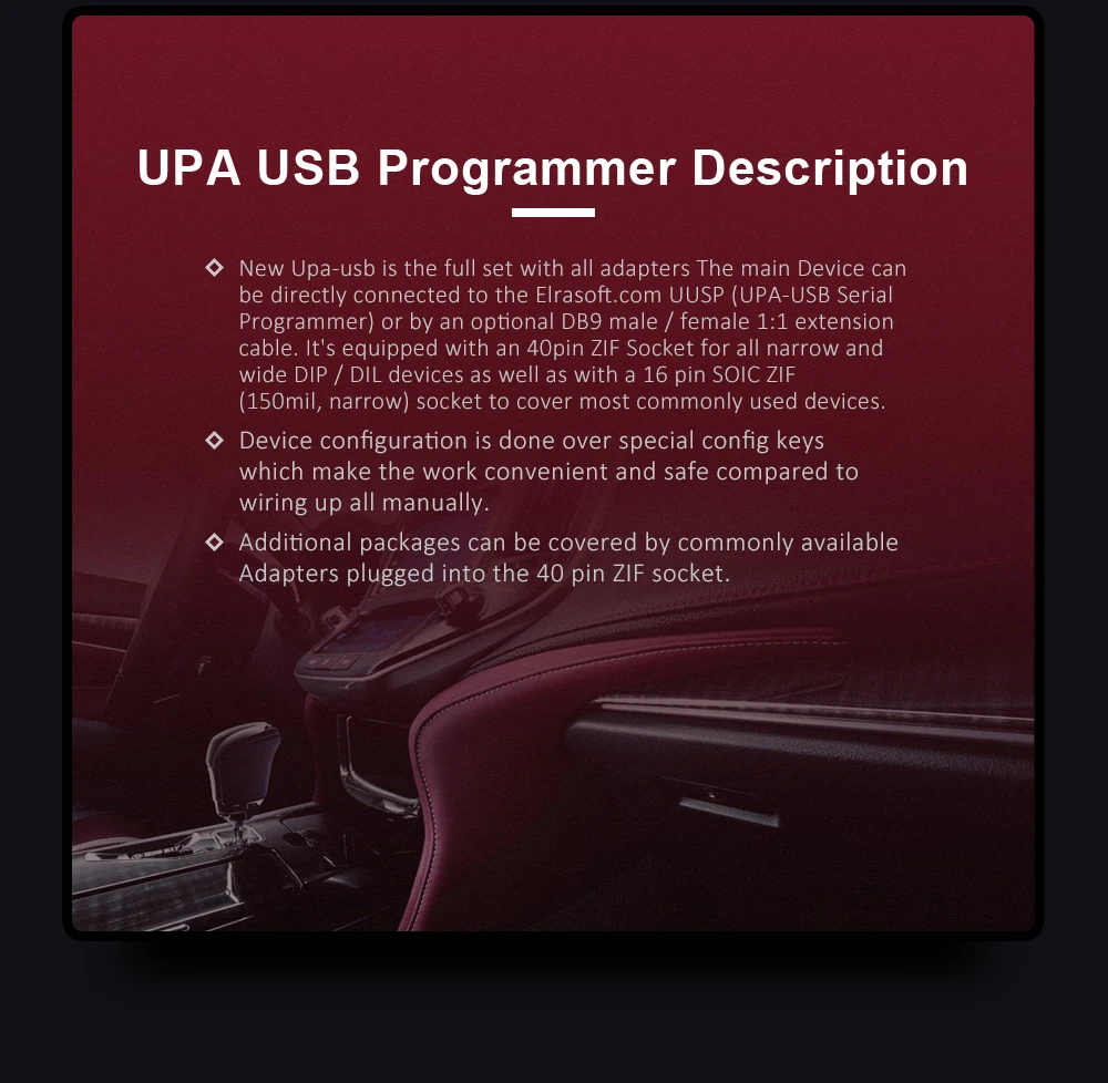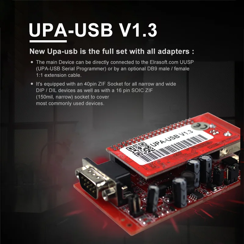 Топ 3 причин получить USB-программатор UPA 1. Язык: английский. 2. Версия оборудования: V2014 3. Программное обеспечение Vesion: V1.3 Описание USB-программатора UPA: Новый УПА-usb-Полный комплект со всеми адаптерами, Основное устройство может быть напрямую подключено к Elrasoft.com UUSP (UPA-USB серийный программатор) Или дополнительным удлинителем DB9 «Папа/мама» 1:1. Он оснащен 40-контактным разъемом ZIF для всех узких и широких устройств DIP / DIL А также с 16-контактным разъемом SOIC ZIF (150mil, узкий) для покрытия наиболее часто используемых устройств. Конфигурация устройства производится с помощью специальных настроек, которые делают работу удобной и безопасной по сравнению с проводкой вручную. Дополнительные пакеты могут быть покрыты распространенными адаптерами, подключенными к 40-контактному разъему ZIF. Основное устройство дополнительно включает в себя 10-контактный ISP-разъем, куда Входящие в комплект адаптеры ISP можно подключить с помощью стандартного flatribbon 1:1 Кабель (в комплекте). Входящие в комплект адаптеры PLCC ISP устанавливаются непосредственно на припаянный чип целевого устройства, что делает работу удобной и безопасной для пайки или использования зажимов, соединяющихся полностью вручную. (Питание от UUSP до цели ISP может быть включено или отключено перемычкой Рядом с 10-контактным разъемом ISP) UPA-USB программатор устройства V1.3 обновленная информация: Добавлена поддержка MC9S12HY64/HA32 Добавлена поддержка последовательной флэш-памяти: A25L512/010/020/040/080/016/032, SST25VF512A/010A/020B/040B/080B/016B/032B, s25FL004A/008A/016A/032A/064A Добавлена поддержка 24C1024, 24C1025 Добавлена объемная Память данных стирания для фотографий 16F913-7/946, 12F629/675 Добавлена функция GetPage сценария Добавлена функция сценария AutoBaudRateDevice (только для устройств hc08) Добавлена функция сценария getprogram merframe childctrl (AChildCtrlName: string): TControl Добавлена функция скрипта enablepicmemoryarea (AProgram, AID, AConfig, ACalibration, AEEPROM: boolean ): boolean; Исправлена ошибка с программным устройством функций сценария, ReadDevice... При использовании с фотографиями Исправлена ошибка с функцией SetHC08SecurityBytes (SecBytes: string) Исправлена ошибка с показанием 68hc11, если генератор не установлен в Auto Обновленные примеры сценариев Программное обеспечение имеет цифровую подпись USB-драйвер upausb.sys имеет цифровую подпись EEproms Просто подключите материнскую плату к программатору UPA напрямую или с помощью удлинителя DB9 «Папа/мама» (1:1). Вставьте правильный конфигурационный ключ в Слот материнской платы и запуск программирования либо через ZIF, либо через сокет SOIC. Вы также можете использовать входящий в комплект DIL на 10-контактный плоский ленточный заголовок, положить Внутри разъема ZIF и Подсоедините Зажим SOIC или зажимы для использования с помощью ISP. Моторола МКУ Выберите адаптер, который вы хотите использовать, прикрепите плоский кабель к адаптеру (PIN1 всегда указан, как на кабеле, так и на адаптере), а также к 10-контактный разъем ISP основной платы. Выберите источник питания VCC перемычкой на материнской плате рядом с разъемом ISP (on = target, поставляемый из УПА, off = target получил собственный запас). Проведите адаптер по припаянному PLCC MCU на целевой печатной плате. (Без пайки, без проверки расщепления, без подсчета контактов, Экономит много времени и хлопот и позволит вам сделать свою работу быстрее, точнее и проще) Как только ваша мастерская будет оснащена нашим набором адаптеров, у вас появится совершенно новый опыт. STMicroelectronics ST62 *: ST6240, ST62