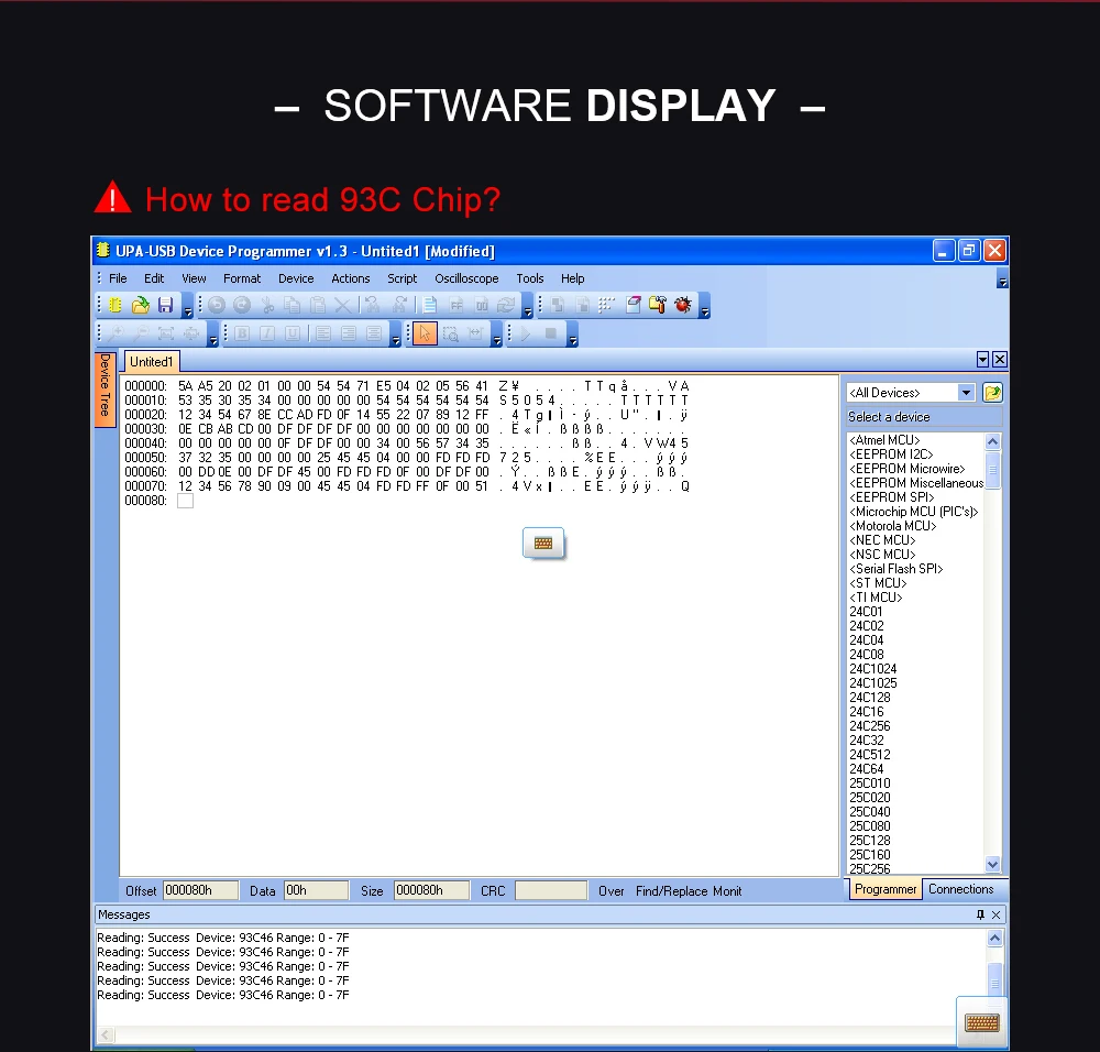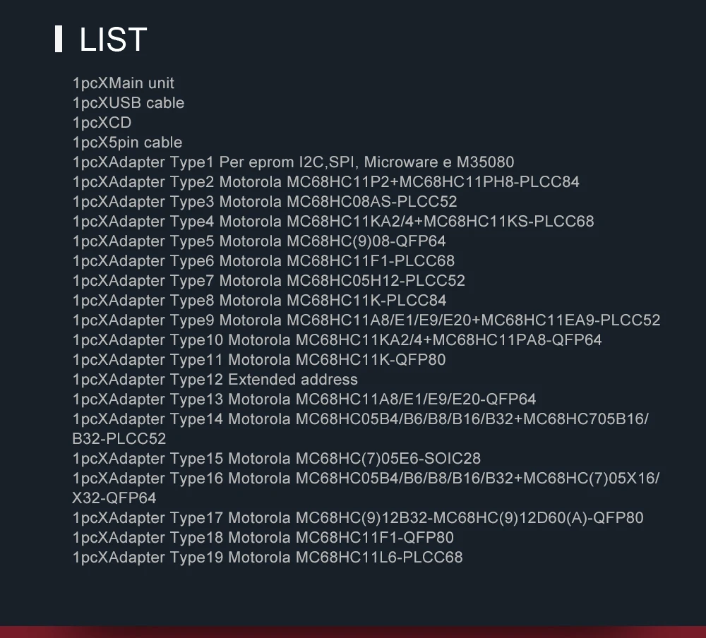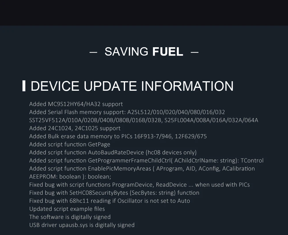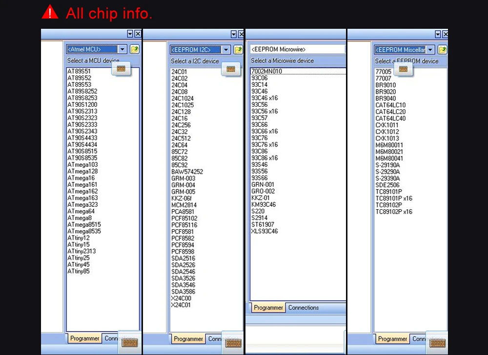Топ 3 причин получить USB-программатор UPA 1. Язык: английский. 2. Версия оборудования: V2014 3. Программное обеспечение Vesion: V1.3 Описание USB-программатора UPA: Новый УПА-usb-Полный комплект со всеми адаптерами, Основное устройство может быть напрямую подключено к Elrasoft.com UUSP (UPA-USB серийный программатор) Или дополнительным удлинителем DB9 «Папа/мама» 1:1. Он оснащен 40-контактным разъемом ZIF для всех узких и широких устройств DIP / DIL А также с 16-контактным разъемом SOIC ZIF (150mil, узкий) для покрытия наиболее часто используемых устройств. Конфигурация устройства производится с помощью специальных настроек, которые делают работу удобной и безопасной по сравнению с проводкой вручную. Дополнительные пакеты могут быть покрыты распространенными адаптерами, подключенными к 40-контактному разъему ZIF. Основное устройство дополнительно включает в себя 10-контактный ISP-разъем, куда Входящие в комплект адаптеры ISP можно подключить с помощью стандартного flatribbon 1:1 Кабель (в комплекте). Входящие в комплект адаптеры PLCC ISP устанавливаются непосредственно на припаянный чип целевого устройства, что делает работу удобной и безопасной для пайки или использования зажимов, соединяющихся полностью вручную. (Питание от UUSP до цели ISP может быть включено или отключено перемычкой Рядом с 10-контактным разъемом ISP) UPA-USB программатор устройства V1.3 обновленная информация: Добавлена поддержка MC9S12HY64/HA32 Добавлена поддержка последовательной флэш-памяти: A25L512/010/020/040/080/016/032, SST25VF512A/010A/020B/040B/080B/016B/032B, s25FL004A/008A/016A/032A/064A Добавлена поддержка 24C1024, 24C1025 Добавлена объемная Память данных стирания для фотографий 16F913-7/946, 12F629/675 Добавлена функция GetPage сценария Добавлена функция сценария AutoBaudRateDevice (только для устройств hc08) Добавлена функция сценария getprogram merframe childctrl (AChildCtrlName: string): TControl Добавлена функция скрипта enablepicmemoryarea (AProgram, AID, AConfig, ACalibration, AEEPROM: boolean ): boolean; Исправлена ошибка с программным устройством функций сценария, ReadDevice... При использовании с фотографиями Исправлена ошибка с функцией SetHC08SecurityBytes (SecBytes: string) Исправлена ошибка с показанием 68hc11, если генератор не установлен в Auto Обновленные примеры сценариев Программное обеспечение имеет цифровую подпись USB-драйвер upausb.sys имеет цифровую подпись EEproms Просто подключите материнскую плату к программатору UPA напрямую или с помощью удлинителя DB9 «Папа/мама» (1:1). Вставьте правильный конфигурационный ключ в Слот материнской платы и запуск программирования либо через ZIF, либо через сокет SOIC. Вы также можете использовать входящий в комплект DIL на 10-контактный плоский ленточный заголовок, положить Внутри разъема ZIF и Подсоедините Зажим SOIC или зажимы для использования с помощью ISP. Моторола МКУ Выберите адаптер, который вы хотите использовать, прикрепите плоский кабель к адаптеру (PIN1 всегда указан, как на кабеле, так и на адаптере), а также к 10-контактный разъем ISP основной платы. Выберите источник питания VCC перемычкой на материнской плате рядом с разъемом ISP (on = target, поставляемый из УПА, off = target получил собственный запас). Проведите адаптер по припаянному PLCC MCU на целевой печатной плате. (Без пайки, без проверки расщепления, без подсчета контактов, Экономит много времени и хлопот и позволит вам сделать свою работу быстрее, точнее и проще) Как только ваша мастерская будет оснащена нашим набором адаптеров, у вас появится совершенно новый опыт. STMicroelectronics ST62 *: ST6240, ST62