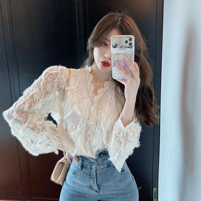 Блузка женская кружевная, с V-образным вырезом и длинным рукавом, 16095