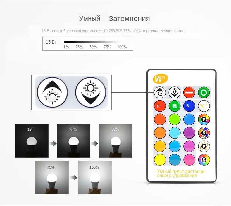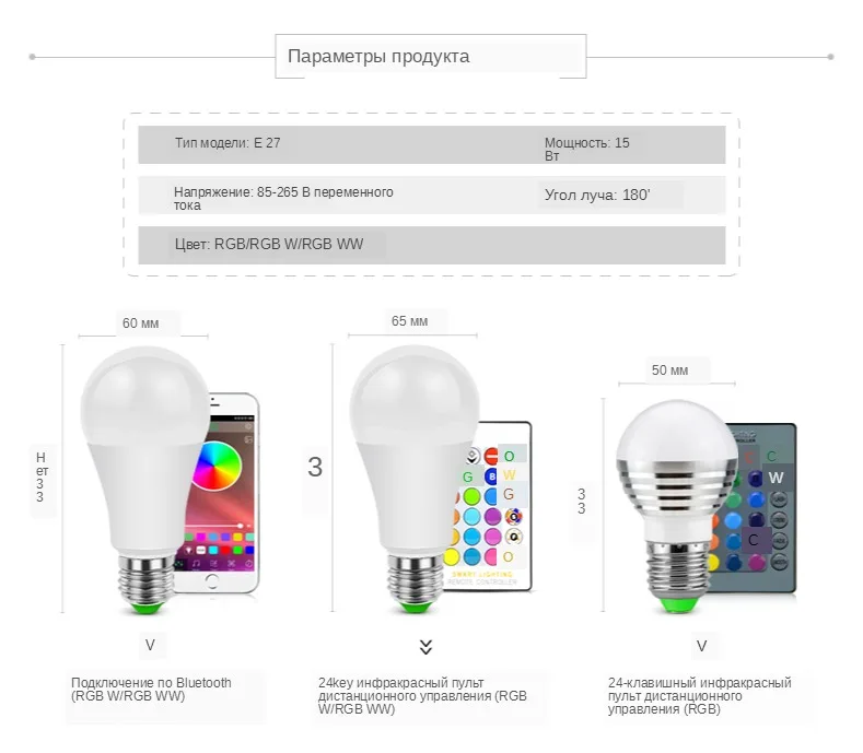 Характеристики: (ИК-пульт дистанционного управления) Основание винта: E27 Мощность: 10 Вт Напряжение: 85-265 в Материал корпуса: алюминий + АБС Цвет излучения: RGBWW (RGB + теплый белый) / RGBW (RGB + белый) Управление: ИК-пульт управления (не включает батарею CR2025) Расстояние дистанционного управления: 5-10 м Режимы: вспышка, стробоскоп, световая подсветка и гладкая Уровни затемнения: 5 уровней затемнения. Характеристики: (управление через приложение Bluetooth) Основание винта: E27 Входная мощность: 15 Вт Материал корпуса: алюминий + АБС Максимальное Радиус действия: 10-15 м Напряжение: 85- 265 В переменного тока Цвет излучения: RGBWW (RGB + теплый белый) / RGBW (RGB + белый).