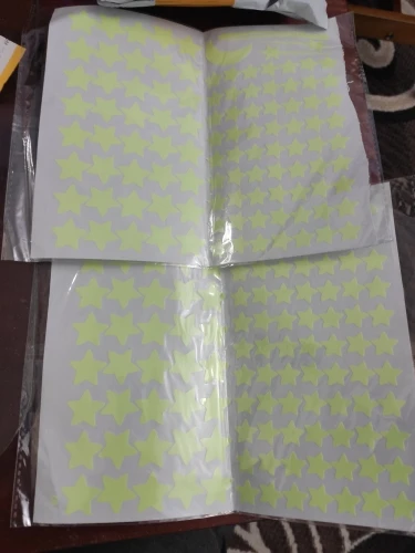 Наклейки хорошие, качество очень приличное. Действительно светятся. Два листа, на одном покрупнее, а второй поменьше. Доехали нормально ничего не помялось. По количеству не считала. Доехали быстро, бросили в ящик. Можно смело брать ещё. Рекомендую продавца, спасибо.