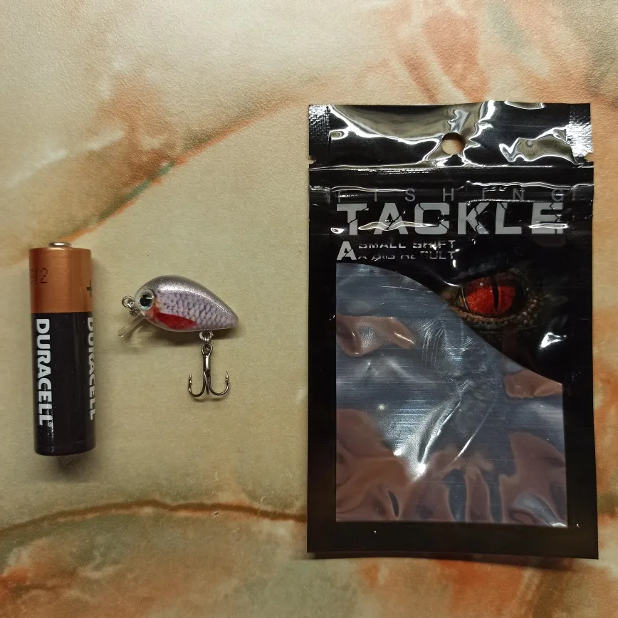 Маленькая пластиковая серебристая рыбка с розоватым отливом. Окрашена аккуратно. Блестящий крючок-тройник размером не больше 5 мм. Заказываю второй раз. Снова доволен товаром. Доставка с отслеживанием чуть больше четырёх недель.