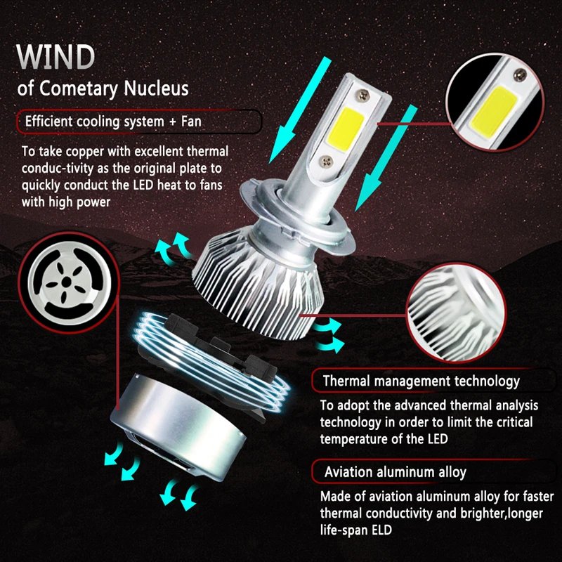 Двусторонний канал отведения тепла 1. Универсальный алюминиевый профиль как система теплопроводности, 360 градусов теплоизлучения 2. Высокоскоростной бесшумный вентилятор (12000 об/мин), высокий поток воздуха для более быстрой скорости охлаждения Посылка входит: 2 светодиодный ные лампы для фар 1x руководство по установке на английском языке