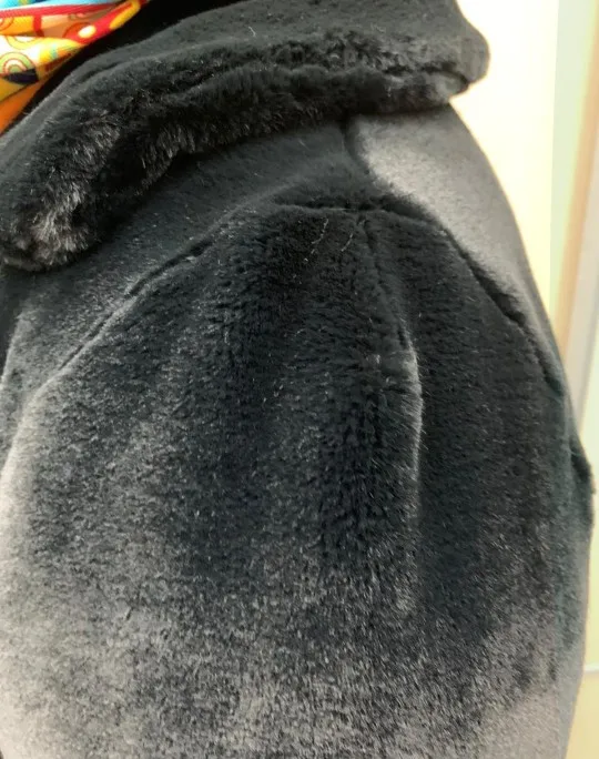 Застежка сразу вырвалась, это при том, что шубу брала с запасом. Плечи на месте, а объем очень велик, буду перешивать застежки, делать запах. Мех тонкий, очень короткий. Выглядит хорошо. Но крой на пузатых дам с узкими плечами.
