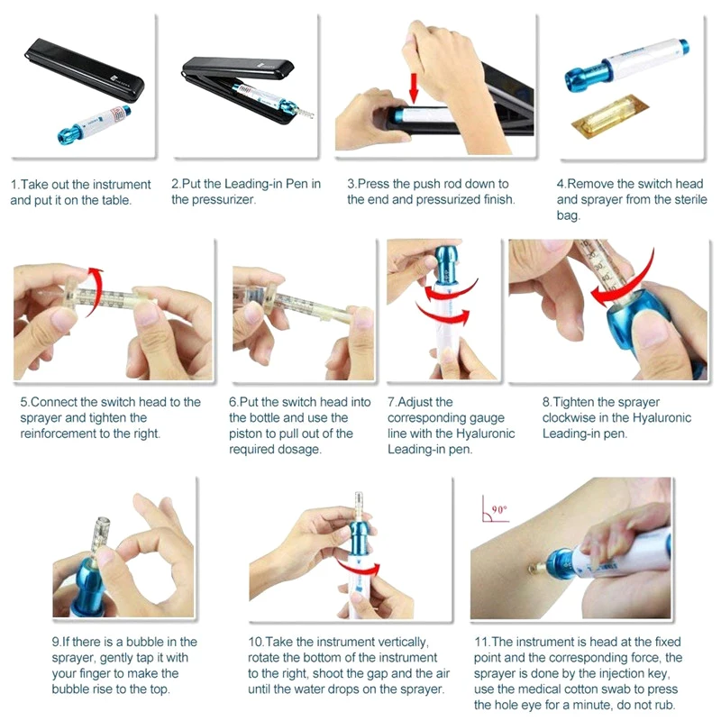 0,5 мл ручка с гиалуроновой кислотой для пептидной терапии Гиалуроновый пистолет для подтягивания губ против морщин ручка для инъекций одноразовый распылитель шприц Новинка Описание продукта: Тип: ручка с гиалуроновой кислотой Особенности: удаление кровеносных сосудов, омоложение кожи, темные круги, удаление морщин, потеря веса, увлажняющий крем, отбеливание, увлажняющий крем Материал: 316 нержавеющая сталь (Профессиональная Медицинская нержавеющая сталь) Объем: 0,5 мл Глубина впрыска: 5 мм Режим работы: Одиночная съемка распыление высокого давления Особенности: 1. Эта продвинутая микро-ручка для инъекций не имеет иглы и избегает любой инвазивной, она принимает технологию давления, разрывается в наномасштабных небольших молекул, чтобы проникать в кожу, чтобы достичь своевременного крупного косметического эффекта. 2. Безболезненная инъекция без игл не вызовет повреждения периферических нервов, поэтому может достичь безболезненного эффекта. 3. Вы можете поместить в шприц очень небольшое количество гиалуроновой кислоты, витамина С или других скиностеров, а затем впрыснуть их в глубину дермы для красоты вашей кожи. 4. После многих раз инъекций, вы увидите мощный результат в коже, омоложение, осветление, увлажнение, молодость, получить изменения качества на вашей коже. 5. Подходит для профессионального использования в салонах красоты, а также домашнего использования самостоятельно. Применение: инъекции, инсулин, растворимый жир, полипептид, дезодорирование, жидкость может быть импортирована, если это не очень густая жидкость. Использование: 1. Выньте инструмент и положите его на стол. 2. Поместите впрыскную ручку в давление. 3. Нажмите толкатель вниз до конца и под давлением. 4. Снимите головку переключателя и шприц из Стерильного мешка. 5. Подключите головку переключателя к шприцу и затяните арматура вправо. 6. Поместите головку переключателя в бутылку и используйте поршень, чтобы вытянуть из требуемой дозировки. 7. Отрегулируйте соответствующий Калибр с помощью ручки впрыска. 8. Затяните шприц по часовой стрелке в ручке для инъекций. 9. Если в шприце есть пузырь, осторожно коснитесь его пальцем, чтобы сделать пузырь поднимается к верхней части. 10. Возьмите прибор вертикально, поверните нижнюю часть инструмента вправо, снимайте зазор и воздух, пока вода не попадет на шприц. 11. Инструмент ориентирован на фиксированную точку и соответствующую силу, инъекция производится с помощью инъекционного ключа, используйте Медицинский ватный тампон, чтобы прижать иглу на минуту, не натирайте. Примечание: Если вы не могли раньше использовать гиалуроновые наполнители (или другие косметические средства), вам не лучше обратиться к косметологу.