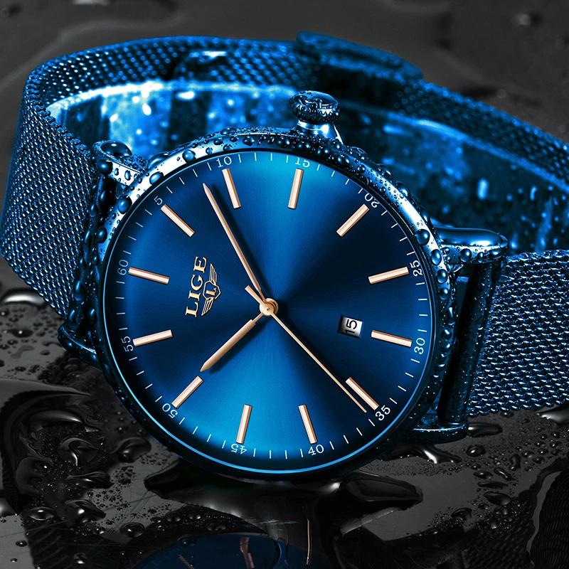 LIGE мужские часы Топ бренд класса люкс водонепроницаемые ультра тонкие часы синий сетчатый ремень модные повседневные кварцевые часы мужские спортивные наручные часы