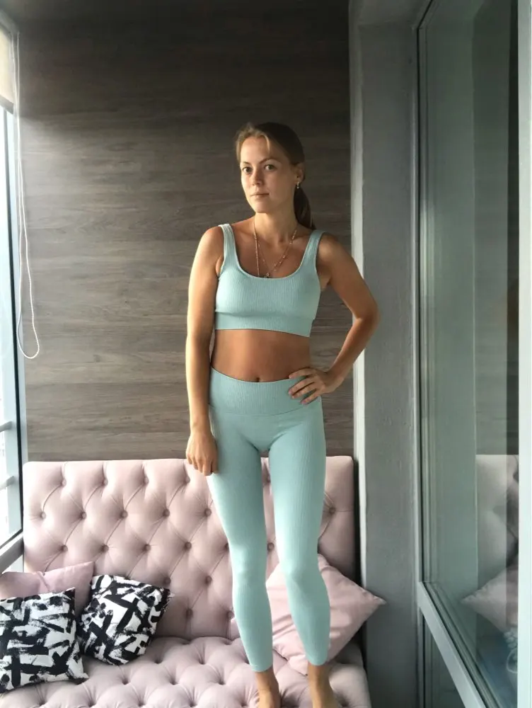 На параметры 90×65×95, заказанный размер M топ сел великолепно, а вот леггинсы оказались большими ничего не утягивают, а свободно облегают, посадка низкая очень, ткань плотная, эластичная, не просвечивает. Доставка быстрая, с продавцом не общалась.