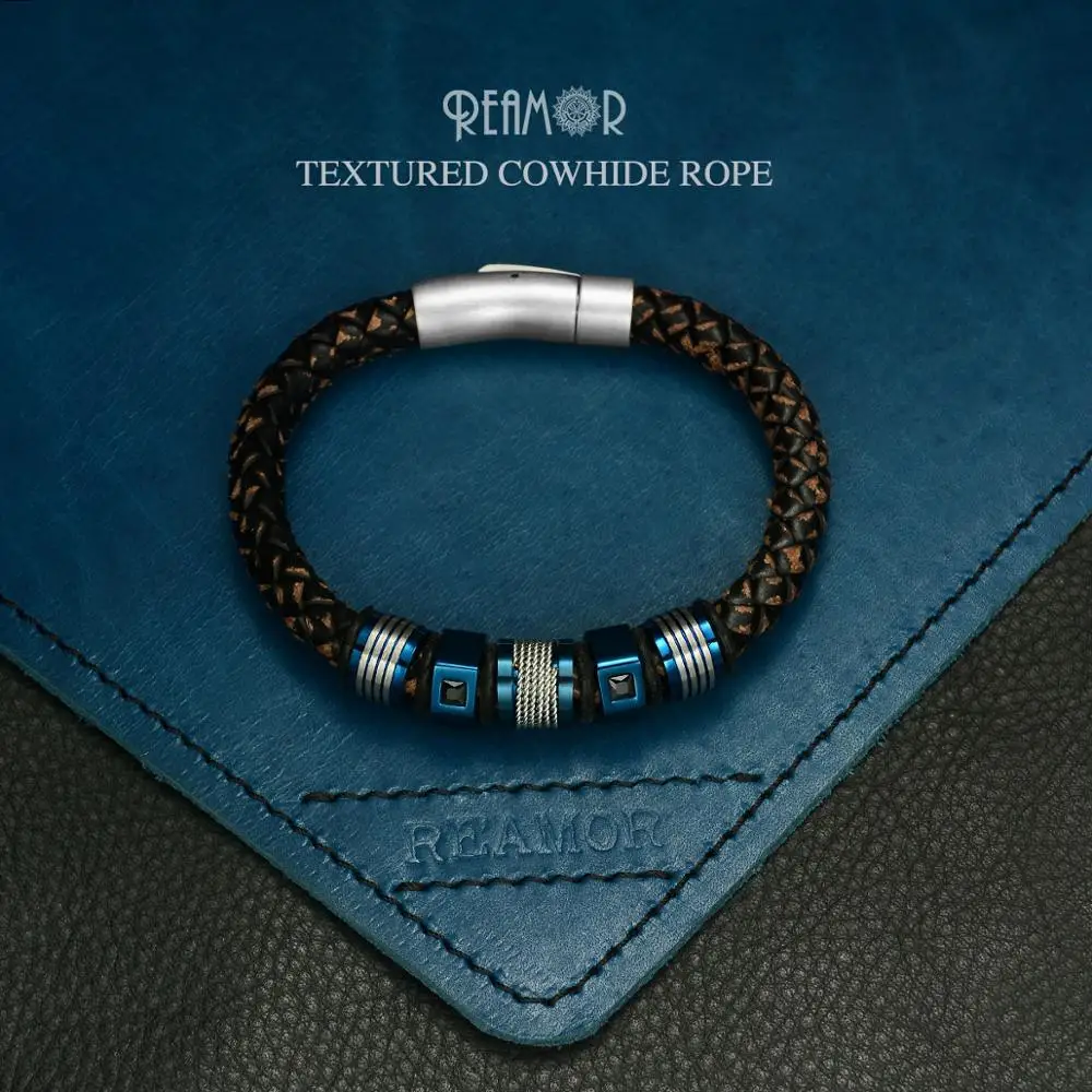 Имя:Мужские ювелирные изделия REAMOR в стиле панк, плетеные браслеты из натуральной кожи с черным цирконием, браслеты из нержавеющей стали с синими бусинами, модный мужской браслет