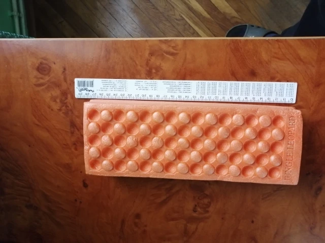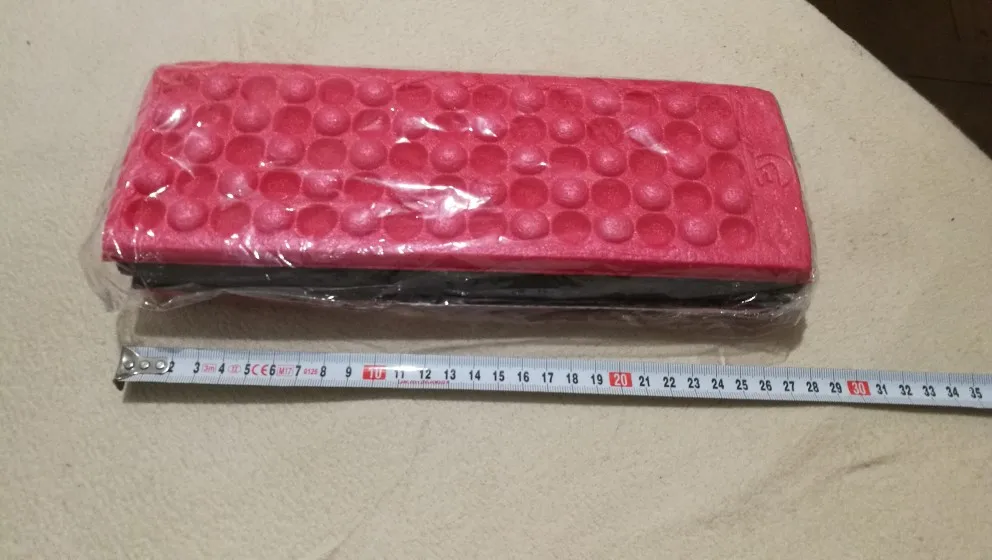 Товар выглядит так же, как на фотографиях. Мы протестировали его, было приятно сидеть, поместить на выпавший, мокрый ствол дерева. Если он сложен, он измеряет 27,5x4x 10 см.
