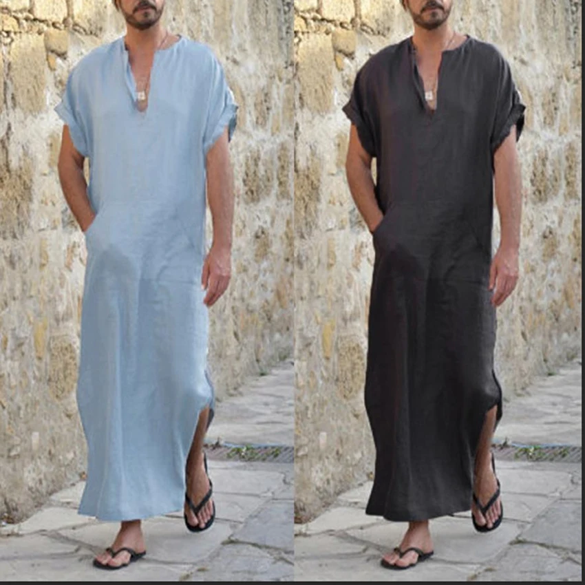 Длинная Мужская мусульманская традиционная одежда, длинный халат, кафтан, летняя рубашка с коротким рукавом