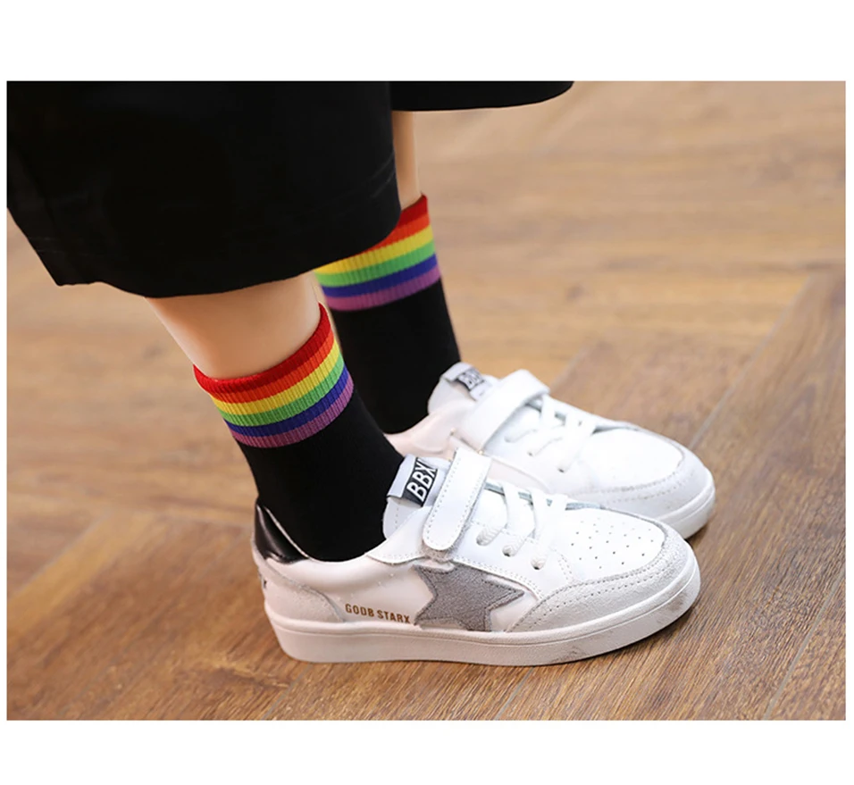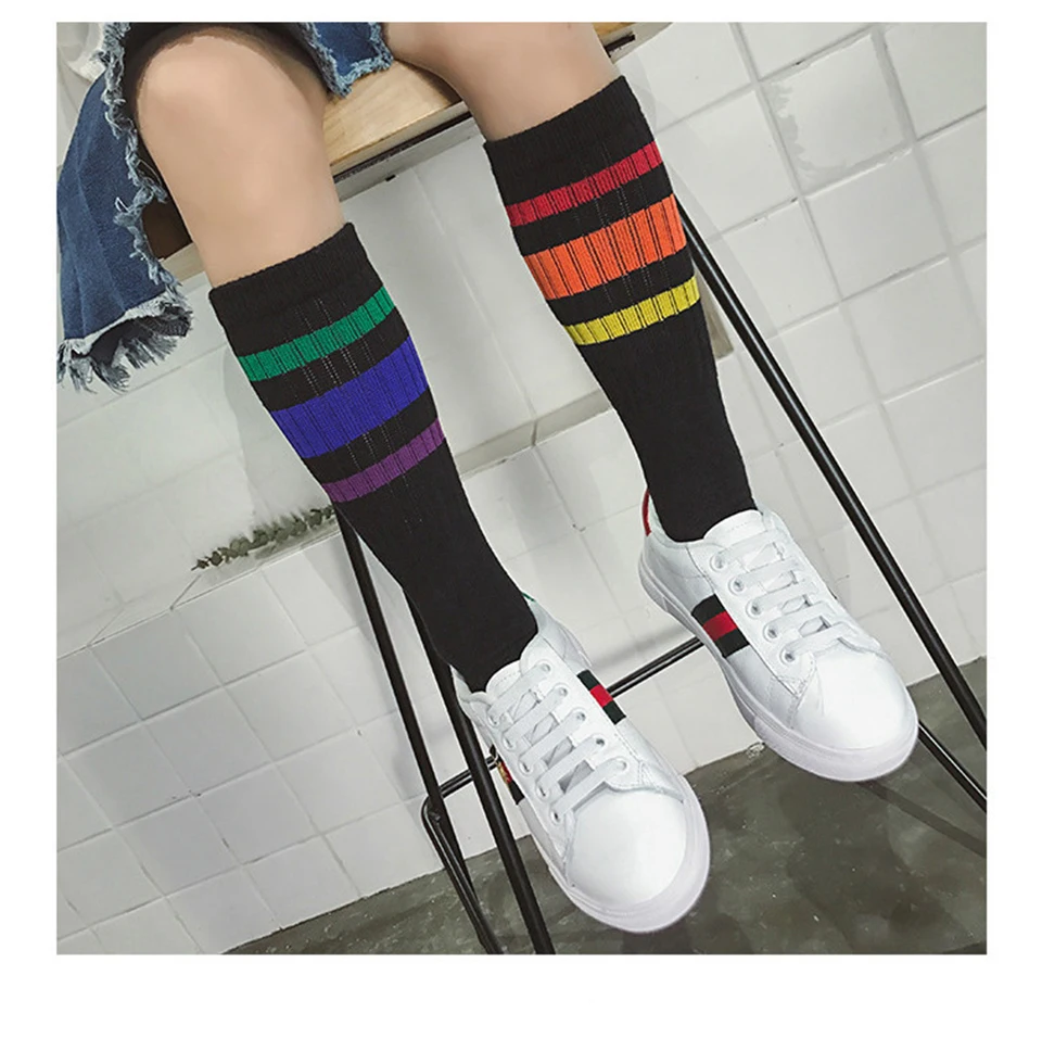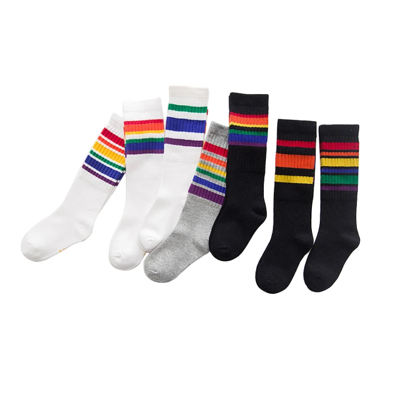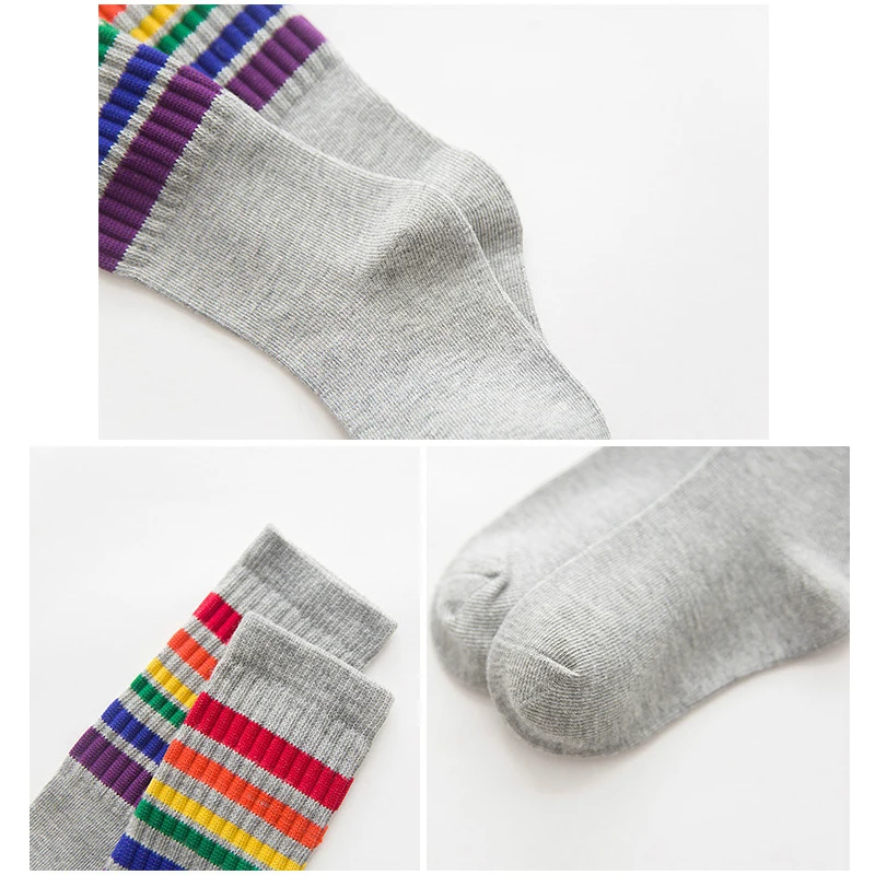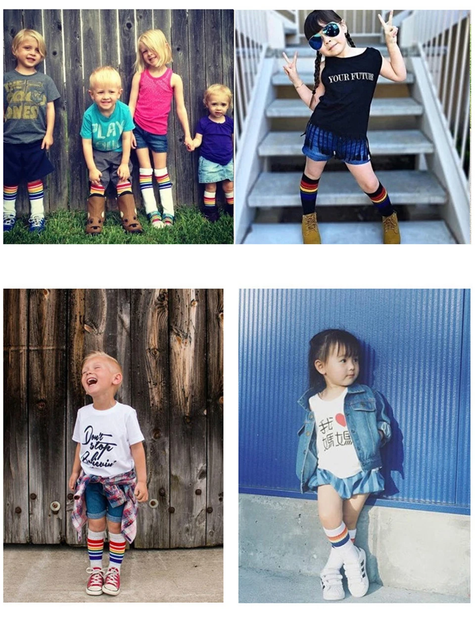 Гольфы для маленьких девочек, радужные носки, цветные, белые хлопковые детские носки в полоску, летние футбольные спортивные длинные носки для маленьких мальчиков и девочек