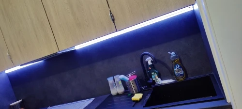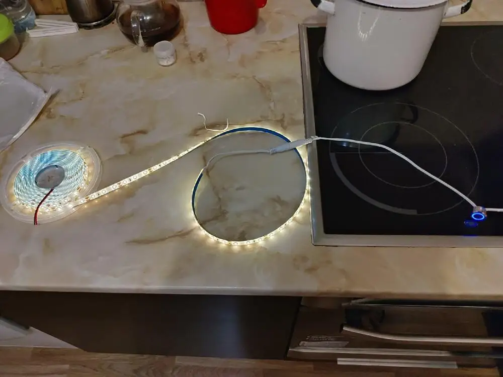 Доставка почти месяц. Хорошая светодиодная лента. Рабочую зону освещает хорошо, регулировка яркости работает. Приклеилась намертво