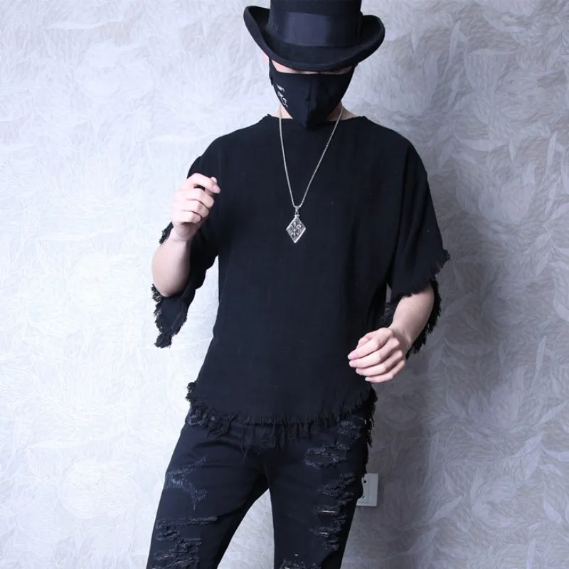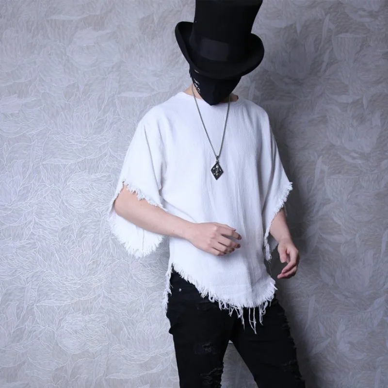 Летние Для мужчин сплошной Цвет футболка оригинальная модная обувь с бахромой обрезки льняные блузки мужской футболки с круглым вырезом футболки Harajuku белые топы в уличном стиле