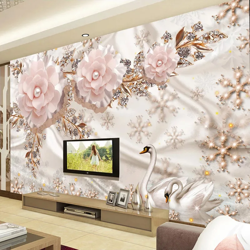 Настенные обои на заказ в европейском стиле, роскошные наклейки 3D в виде лебедя, ювелирные украшения, розовые цветы, самоклеящиеся обои любого размера для гостиной