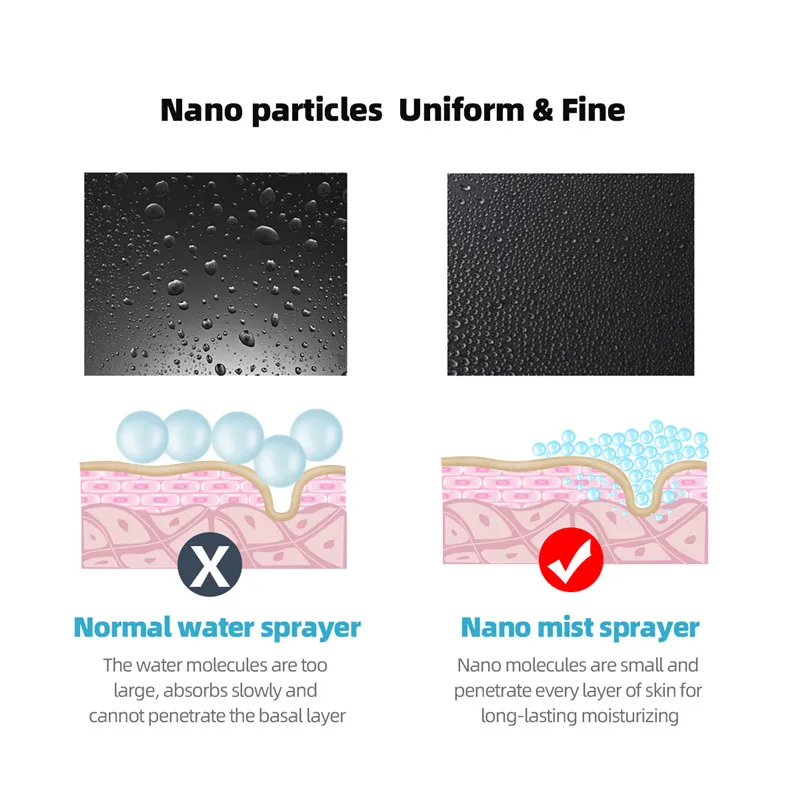 Использует высокоскоростную вибрационную технологию для разделения воды на крошечные частицы нанометров, проникающие от инфильтрации кутикулы к базальному слою, этот мини-парогенератор для лица мгновенно увлажнит вашу кожу, позвольте вашей коже оставаться влажной в любое время.