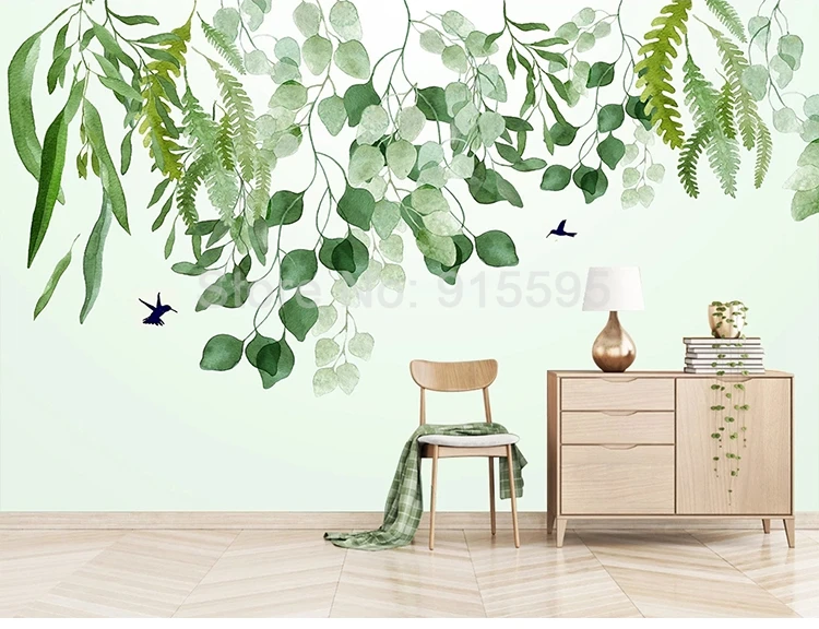 Пользовательские 3D фото обои ручная роспись зеленые листья Современная Фреска водостойкая парусиновая ткань самоклеющиеся снимающиеся наклейки Фреска