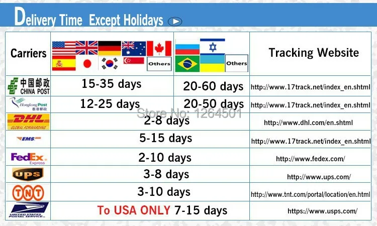* Доставка DHL обычно занимает 3-5 дней. * EMS обычно доставляет вас в течение 7-15 дней. * Авиапочта Китая, epacket обычно доставляется по всему миру в течение 15-35 дней.