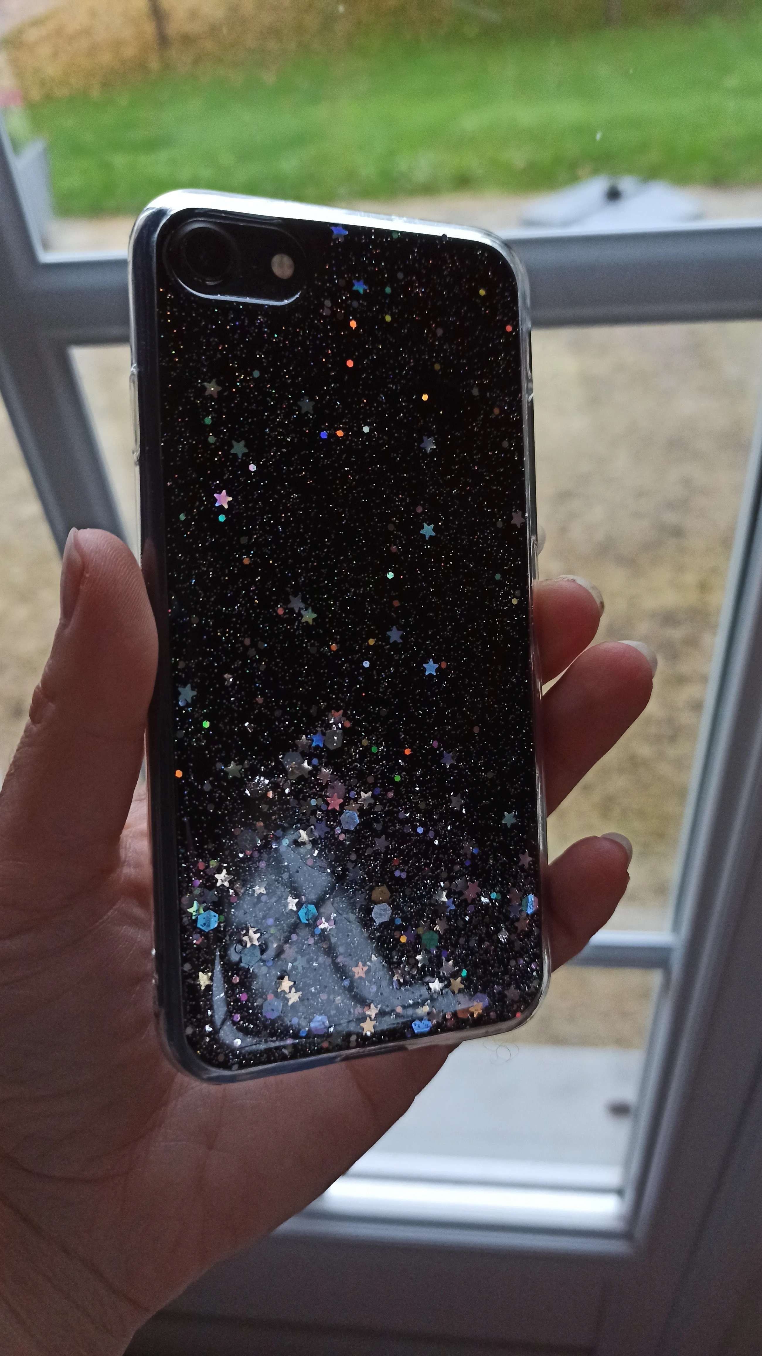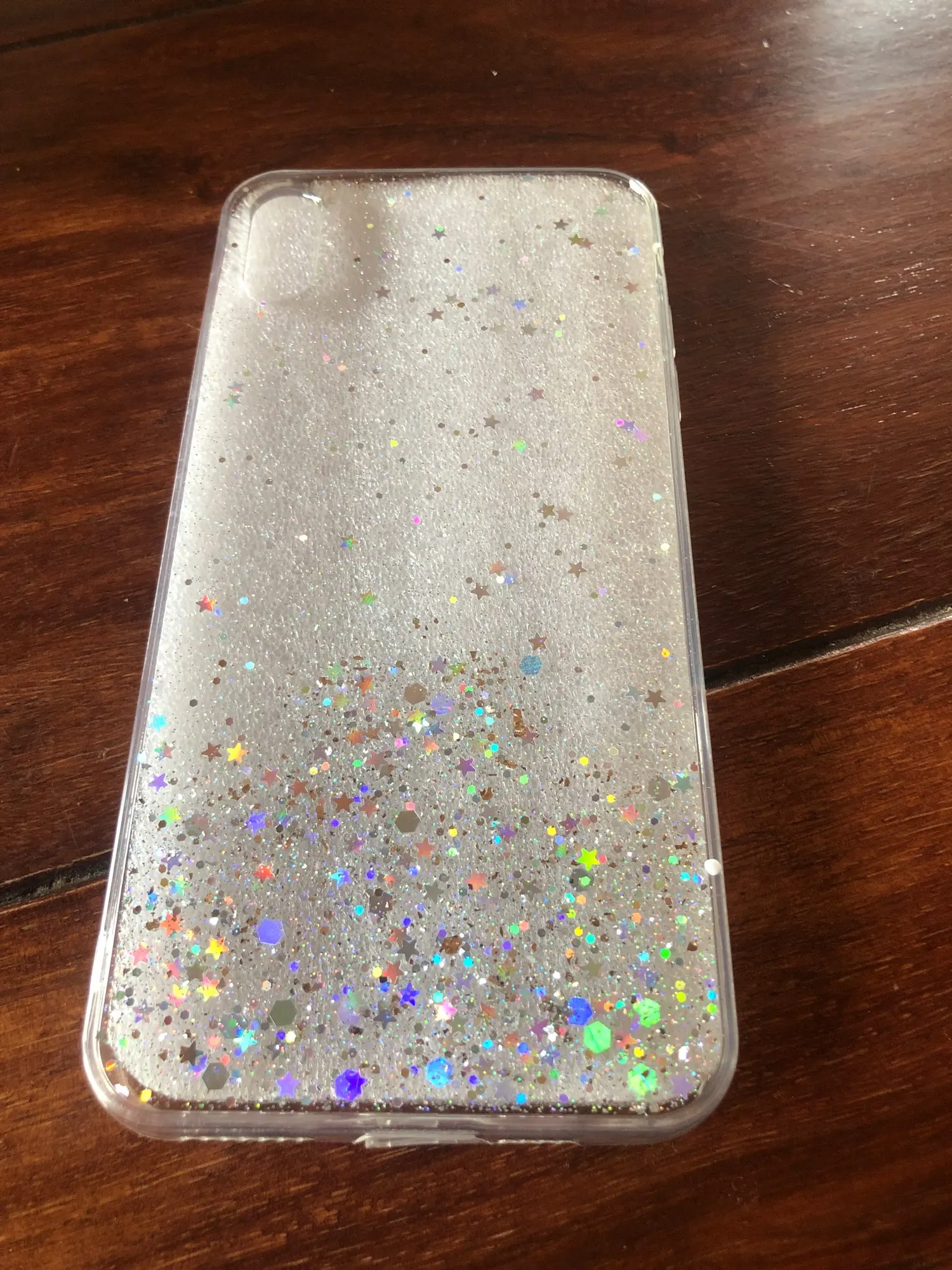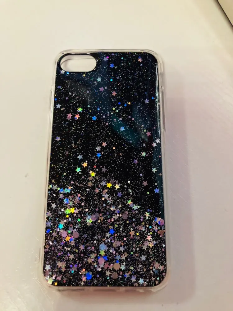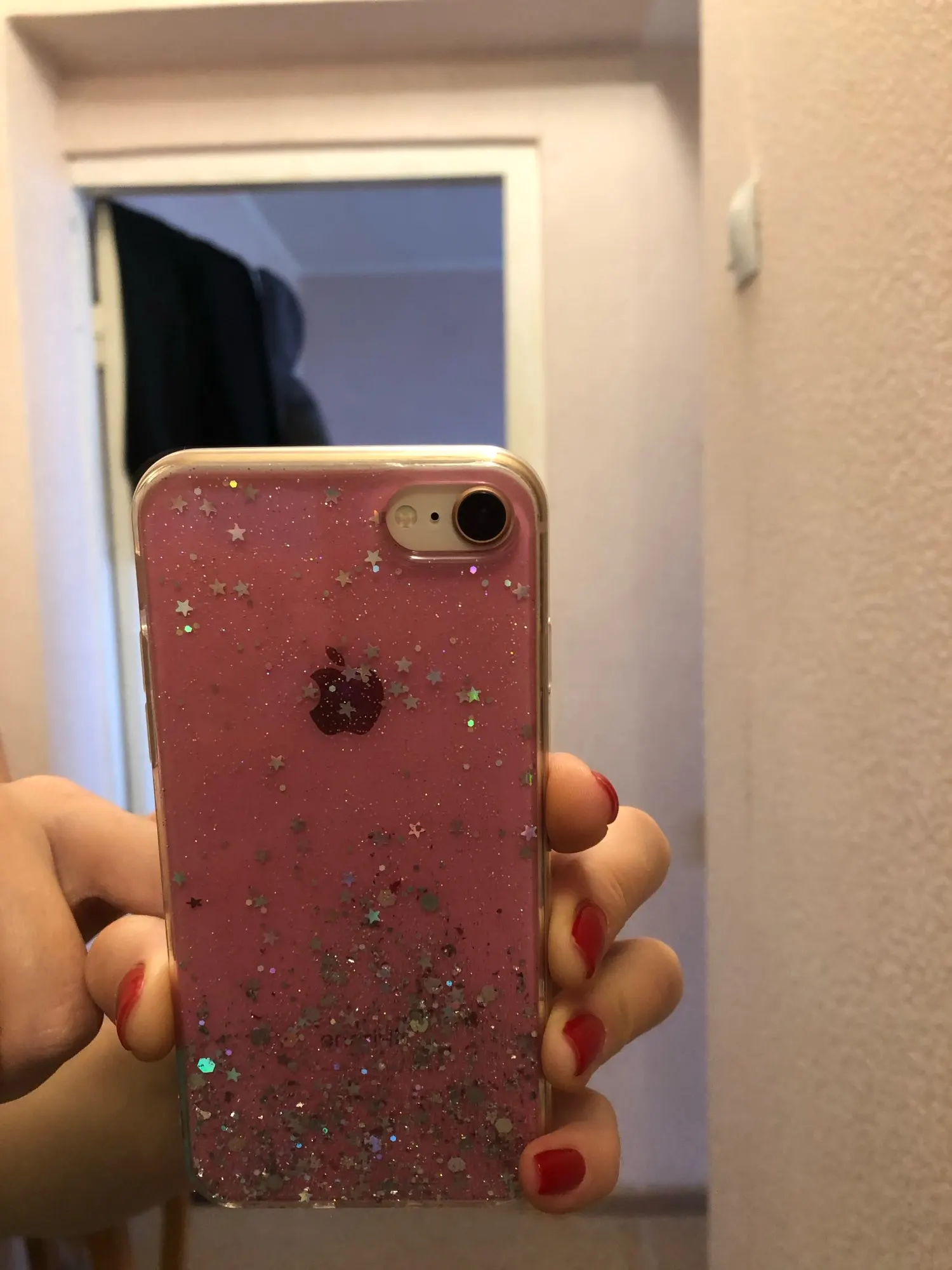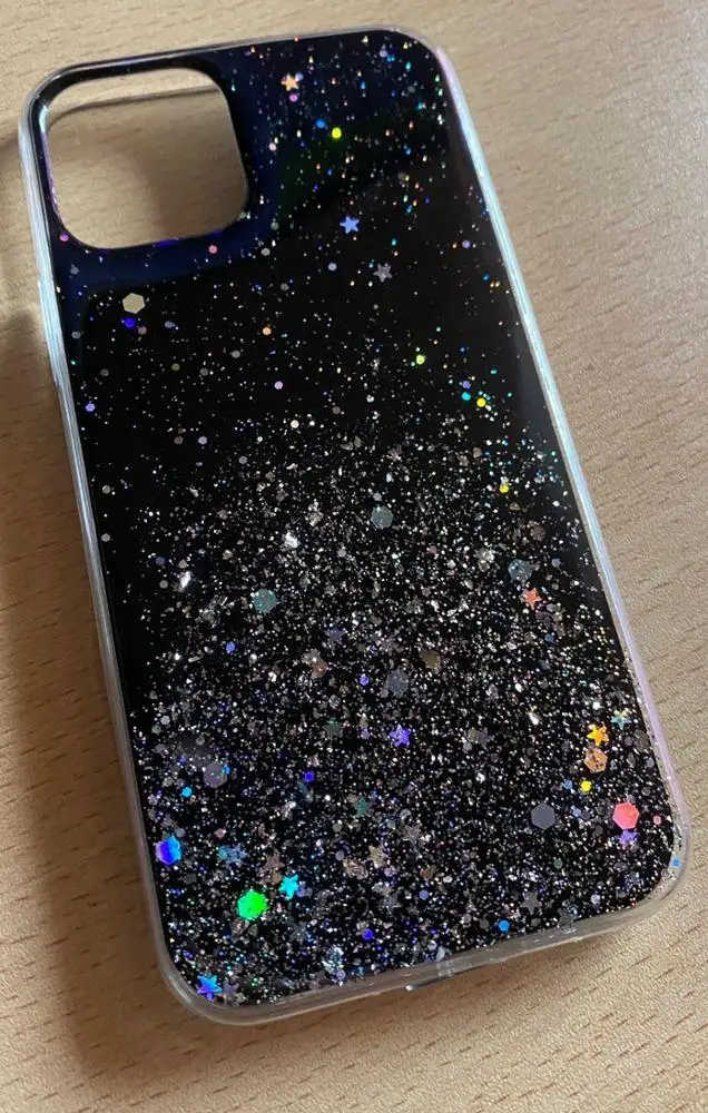 Снимаю балл за то, что чехол не соответствует картинке. На картинке есть логотип айфона, на чехле его нет. Просто чёрный не прозрачный чехол с блёстками. В целом довольно симпатичный. Пришел без изъянов.