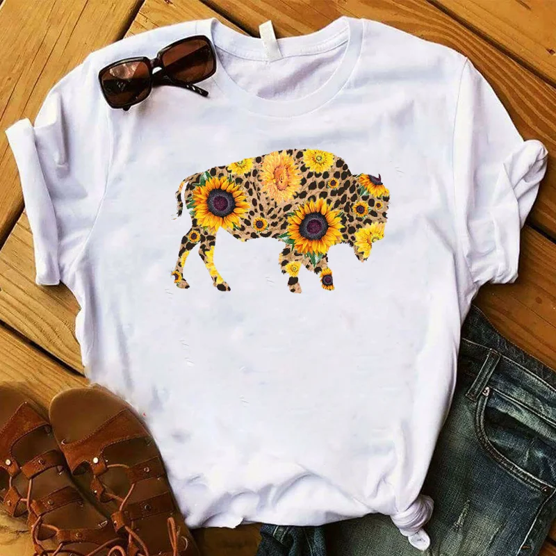 Футболка женская летняя графическая с принтом, топ с рисунком быка, крупного рогатого скота, хеницы подсолнуха, дикая одежда