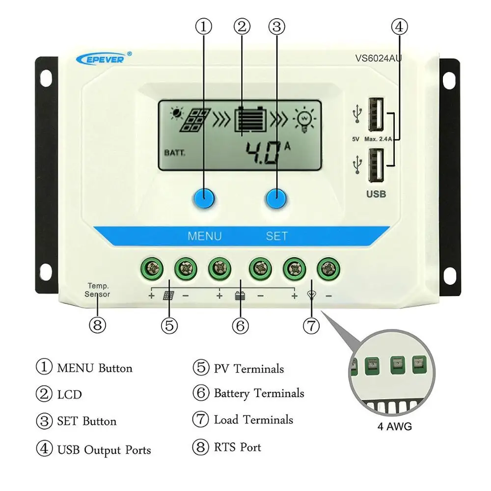 Это на ощупь намного выше, чем у моего старого. Старый, который я должен был построить свой собственный монитор напряжения/тока солнечной батареи и измеритель напряжения плюс тока на аккумуляторах (плюс и минус измерители тока намного дороже). Мне действительно нравится иметь дисплей напряжения, тока и кВт для солнечных элементов, батареи и загружать все на лицевой дисплей устройства. Если вы нажмете кнопку set (правая кнопка), вы можете выключить нагрузку и включить не только клеммы загрузки, но и USB. Вниз по бокам вы не можете настроить (тонкую настройку) зарядное напряжение батареи, напряжение выключения (низкое напряжение отключения). Это заняло пару дней для подключения цепи зарядки к нулю в мои батареи и выход батареи. В этом ценовом положении нет ничего идеального, но характеристики перевешивают недостатки. Продавец отправил быстро и использовал эффективную логистическую компанию.