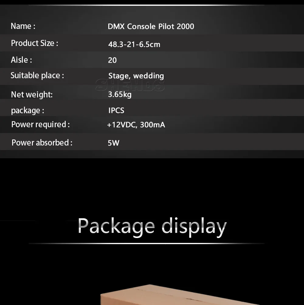 * Канал DMX: 1024* Шаг сцены: 600* Сцены для одновременной работы: 10* Графика для каждой сцены: 5* Приспособление: 96* Графика может работать одновременно Количество: 10* Фейдеры и Затемнение: Поддержка* Панорамирование/наклон Swop: Да* Выход обратного канала: Да* Модификация уклона канала: Да* Сцена и диммер ползунком: Да* Сцена с кнопкой управления: Да* Размер продукта: 47,5x35x10 см* Вес: 8,55 кг