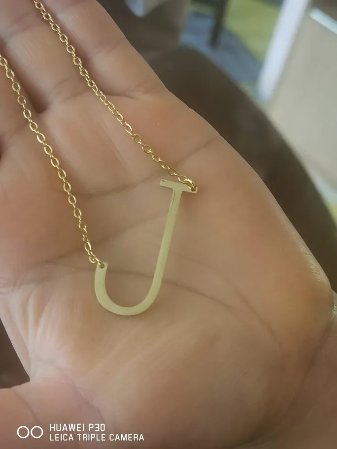 Łańcuszek przepiękny, bardzo duża literka. Z daleka widoczna. Kolor troszkę wpadający w żółty ... największym plusem jest to ze z łańcuszkiem nic się nie dzieje kiedy śpię, biorę prysznic. Nigdy go nie zdejmuje :)