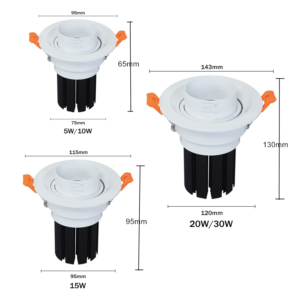 Мощность: 5 Вт 10 Вт 15 Вт Световой поток: 110 лм/Вт светильник растягивается: светильник может вверх и вниз, что может достигать 15 ° или 45 ° или 60 ° Цветовая температура: теплый белый (3000-3500K), натуральный белый (4000-4500K), белый (6000-6500K)