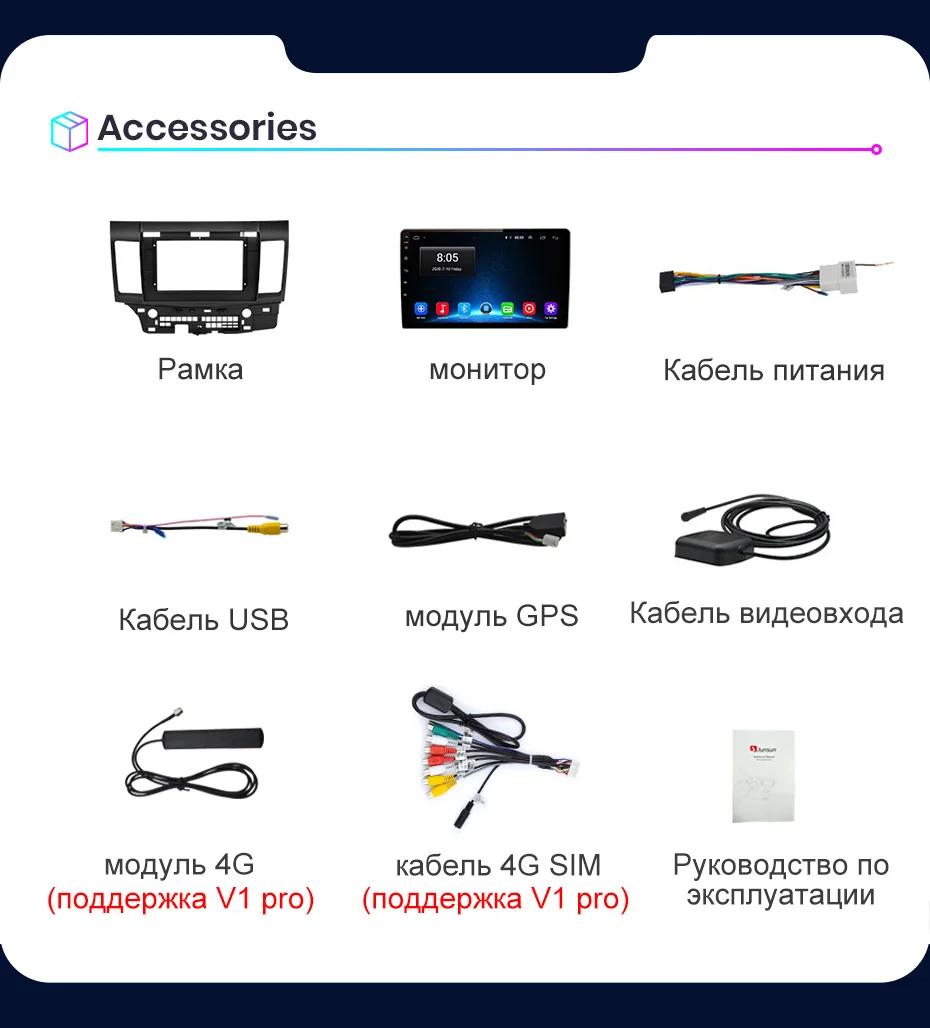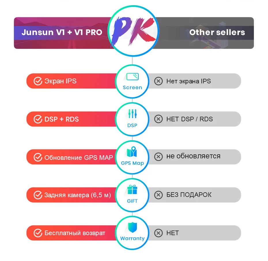 > Основные функции: Android 10.0 + 10-дюймовый экран IPS + четырехъядерный процессор 1,2 ГГц (8 ядер 1,8 ГГц можно выбрать) + DDR3 1 ГБ флэш-памяти (2 ГБ / 4 ГБ / 6 ГБ можно выбрать) + 16 ГБ памяти (32 ГБ / 64 ГБ / 128 ГБ можно выбрать) + WIFI (сеть 4G можно выбрать) + Mirror link + Управление рулевым колесом + RDS / DSP (можно выбрать) > Специальные функции:1. PIN к PIN: кабель питания авторадио Junsun это PIN к PIN, прост в установке;2. Встроенный Carplay / Android Auto: поддержка версии V1 / V1Pro, просто используйте телефонный кабель, подключите его, стабильный и простой в использовании;3. Поддержка подголовника: поддержка только версии Junsun V1;Дополнительные аксессуары> Управление голосом AI: только Junsun поддерживает версию PRO, просто скажите командное слово, управляйте авторадио без рук.Вождение будет безопаснее;> ADAS DVR, контроль давления в шинах, OBD2, внешний микрофон, кабель RCA;>> Отличное обслуживание клиентовВ Junsun наша цель - продолжать упорно работать над созданием инновационного аппаратного и программного обеспечения для автомобильного мультимедийного проигрывателя радио, чтобы предоставить вам индивидуальный опыт.Мы БЕСПЛАТНО предоставляем обновления для прошивки, программного обеспечения и карт GPS навигации .