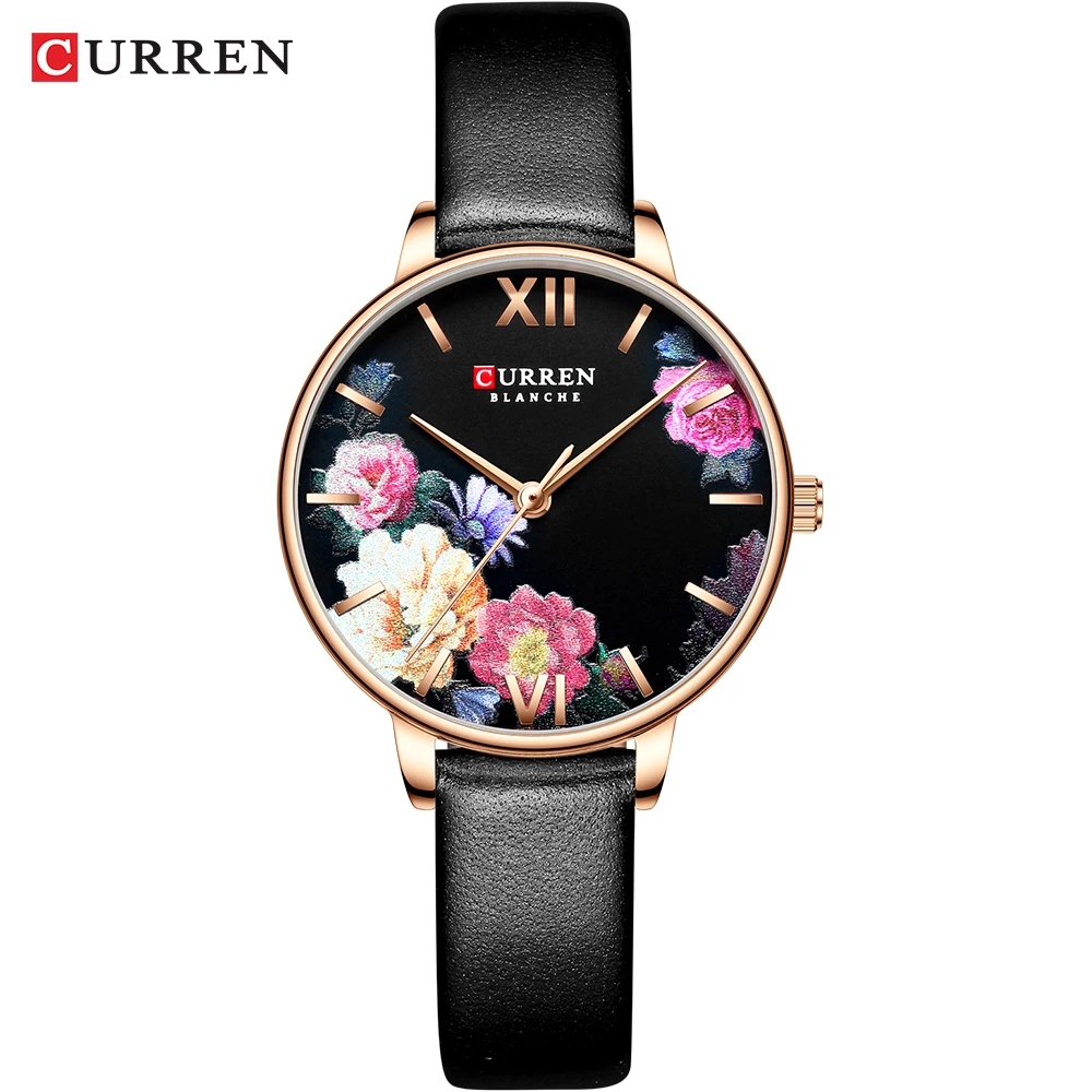 Женские кварцевые часы CURREN, классические черные наручные часы с кожаным ремешком, с цветочным принтом, 2019
