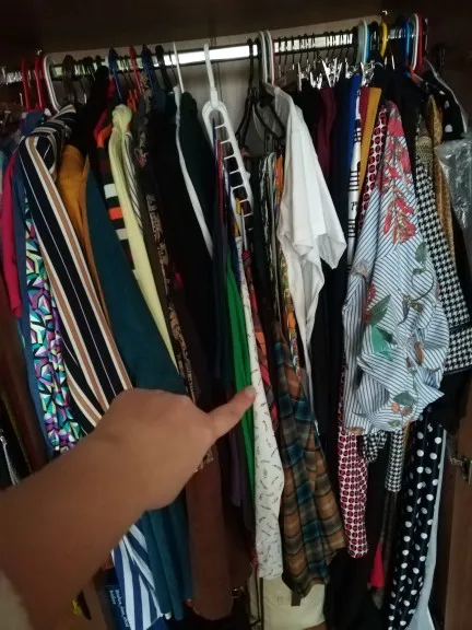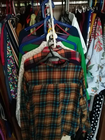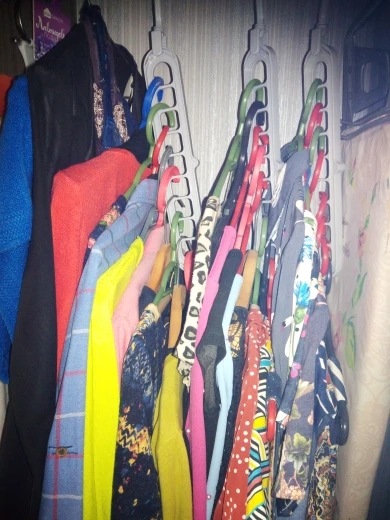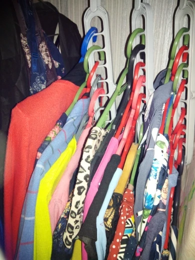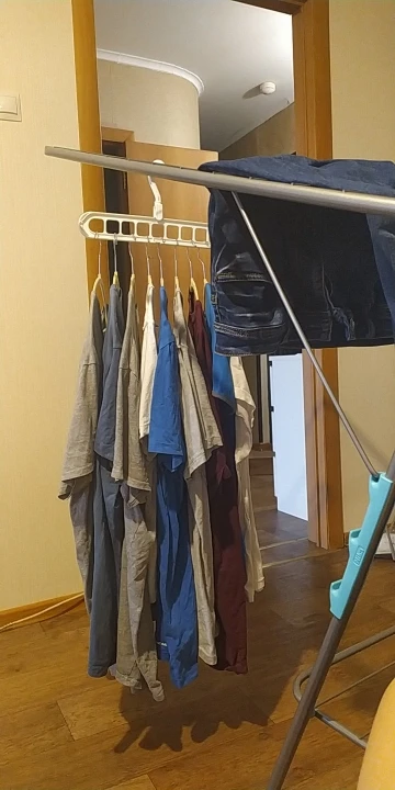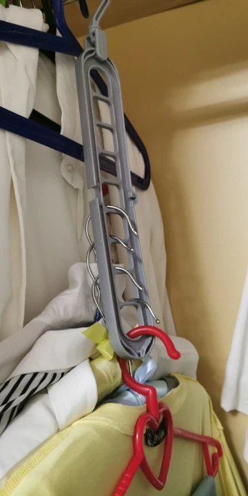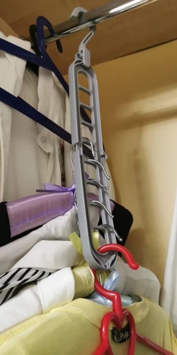 Не поняла, зачем мне эта вещь, когда на неё навешаешь, в том порядке, что указано, то выпирая, эта конструкция с одеждой занимает столько же места, что и плечики с этой одеждой на штанге. Пока висит так