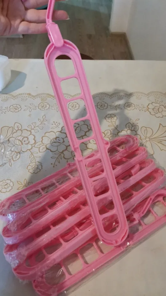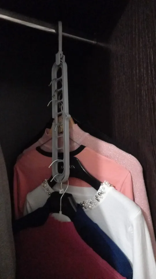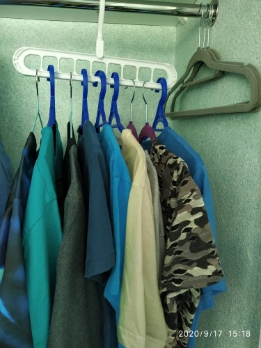 Доставка в Москву 2 недели. На фото видно реальную экономию места в шкафу - 9 вещей на этой вешалке и 9 вещей если вещать как обычно. Если шкаф с глухим углом, тоже очень удобно, хоть видишь, что там висит см. фото Вещь очень полезная, но только не для наглаженных рубашек с воротниками, они помнутся. Также жаль, что пластиковая, была бы стальная или деревянная прослужила бы дольше. Покупать советую