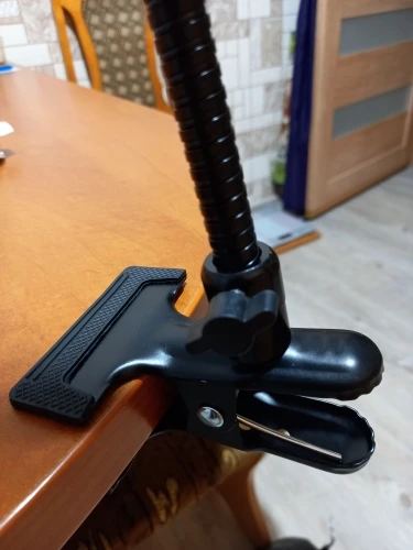 Люфтит при фиксации к столешнице, нужно подкладывать какую-то прокладку до толщины захвата, чтоб держатель был зафиксирован и не шатался. Тяжело гнётся подвижная часть.