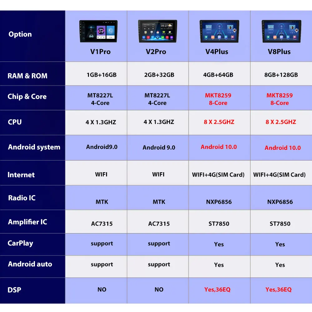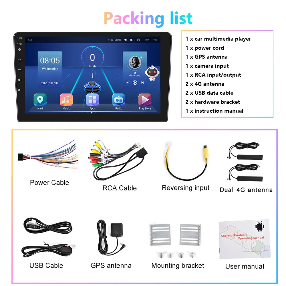 Спецификация:Система: Android 9,0/Android 10,0Чипсет: 4 ядра/8 ядерСкорость работы: 1,3 ГГц/2,5 ГГцРазмер экрана: 9''Разрешение экрана: 1024*600Память:1 Гб (RAM) + 16 Гб (ROM)2 Гб (RAM) + 32 Гб (ROM)4 Гб (RAM) + 64 ГБ (ROM)8 ГБ (RAM) + 128 ГБ (ROM)Выходная мощность: 4*45 ВтУсилитель мощности: ST7850Радиочип: NXP6856Звуковой эффект: ADI/HI-Res: 192 кГц/32 битИнтеллектуальный Голос: Встроенный стандарт (только для 4G радио)Разделенный экран: Опциональная функцияCarplay: Беспроводная + Проводная (Опциональная функция)Выход Android: проводнойАвтомобиль Android: проводнойФункция управления рулем: ПоддержкаВерсия Bluetooth: 2,0/5,0Радиочастотный диапазон: FM/AM/RDS (опционально функция)Карта: встроенная автономная карта (требуется загрузка через Интернет)WIFI: поддержкаИнтернет: 4G карта (только для 4G радио)USB: двойной USB интерфейсDSP: ПоддержкаAHD Камера: ПоддержкаOBD2: ПоддержкаDAB +: ПоддержкаВидеорегистратор на жестком диске: ПоддержкаСистема контроля давления в шинах: ПоддержкаВидеовыход: ПоддержкаСсылка на телефон: поддержкаНавигационная карта: GPS/BDS/GlonsВнешний микрофон: ПоддержкаФормат аудио: APE/FLAC/WAV/MP3/WMA и т. Д.Формат видео: MKV/RMVB/AVI/MP4/MDV и т. Д.Формат изображения: PNG/JPEG/JPG/GIF/WBMP/BNP и т. Д.Языки: китайский/английский/французский/итальянский/Корейский/японский/арабский/испанский/португальский/русский/Турецкий/Вьетнамский/Иврит/Польский/немецкий и т. Д.Посылка включает в себя:1 х Автомобильный мультимедийный плеер1 х шнур питания1 x Антенна GPS1 x вход камеры1 х RCA вход/выход2 usb-кабеля для передачи данных2 крепежных кронштейнаРуководство по эксплуатации-1 шт.