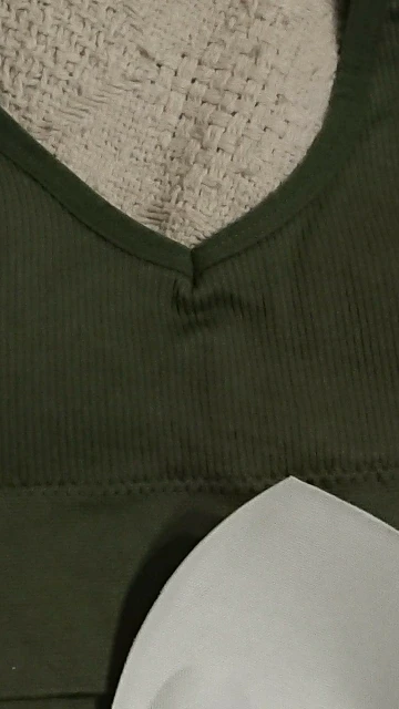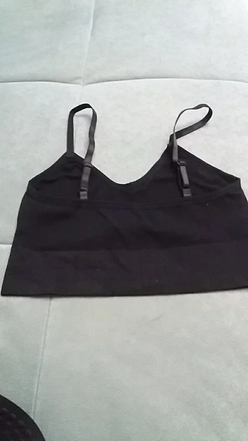 Топ пришел с затяжкой на лицевой стороне спереди. Материал мягкий, не поддерживает грудь. Белый вкладыш для груди через ткань просвечивается сильно. Топ немного закатывается при носке под грудью.