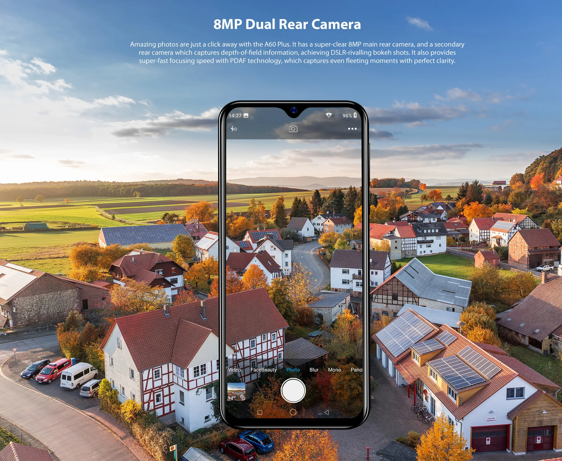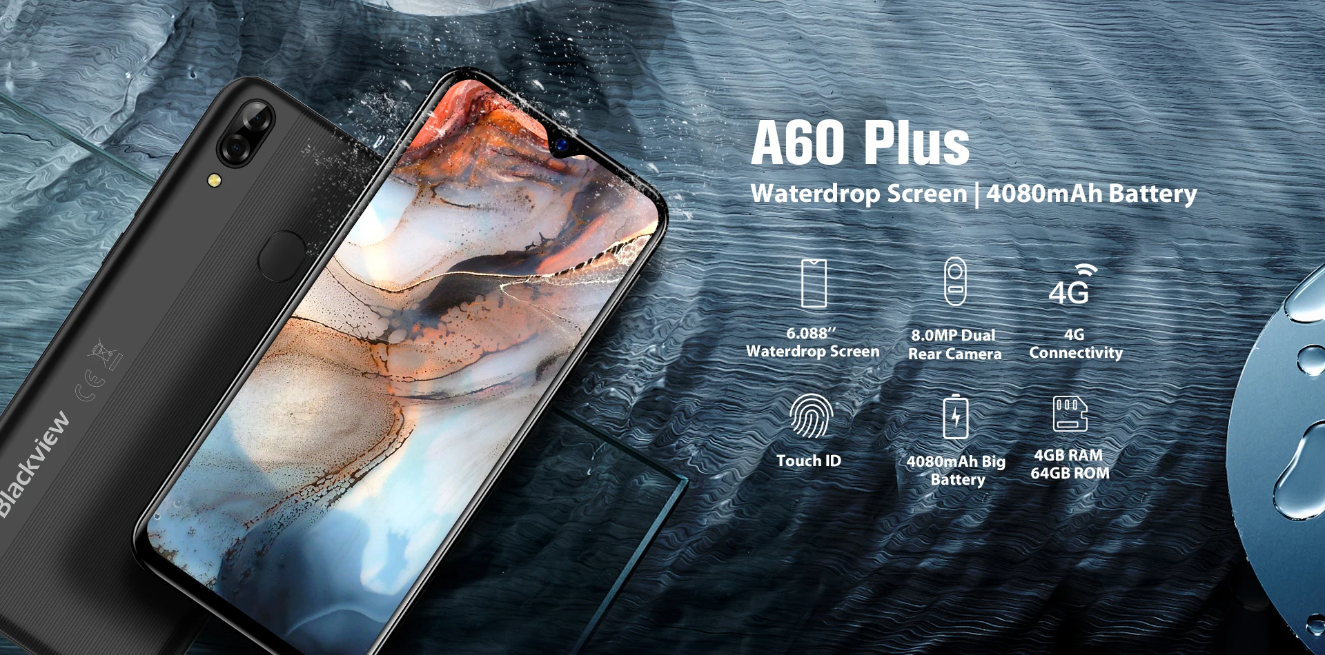 Blackview A60 плюс ОС: Android 10,0 ЦП: четырехъядерный процессор SIM: две нано sim-карты Батарея: 4080 мАч Память: 4 Гб ОЗУ 64 Гб ПЗУ Дисплей: 6,088 ''HD + экран капли воды Задняя камера: 5.0MP + 8.0MP двойная камера Функция: экран капли воды, Touch ID