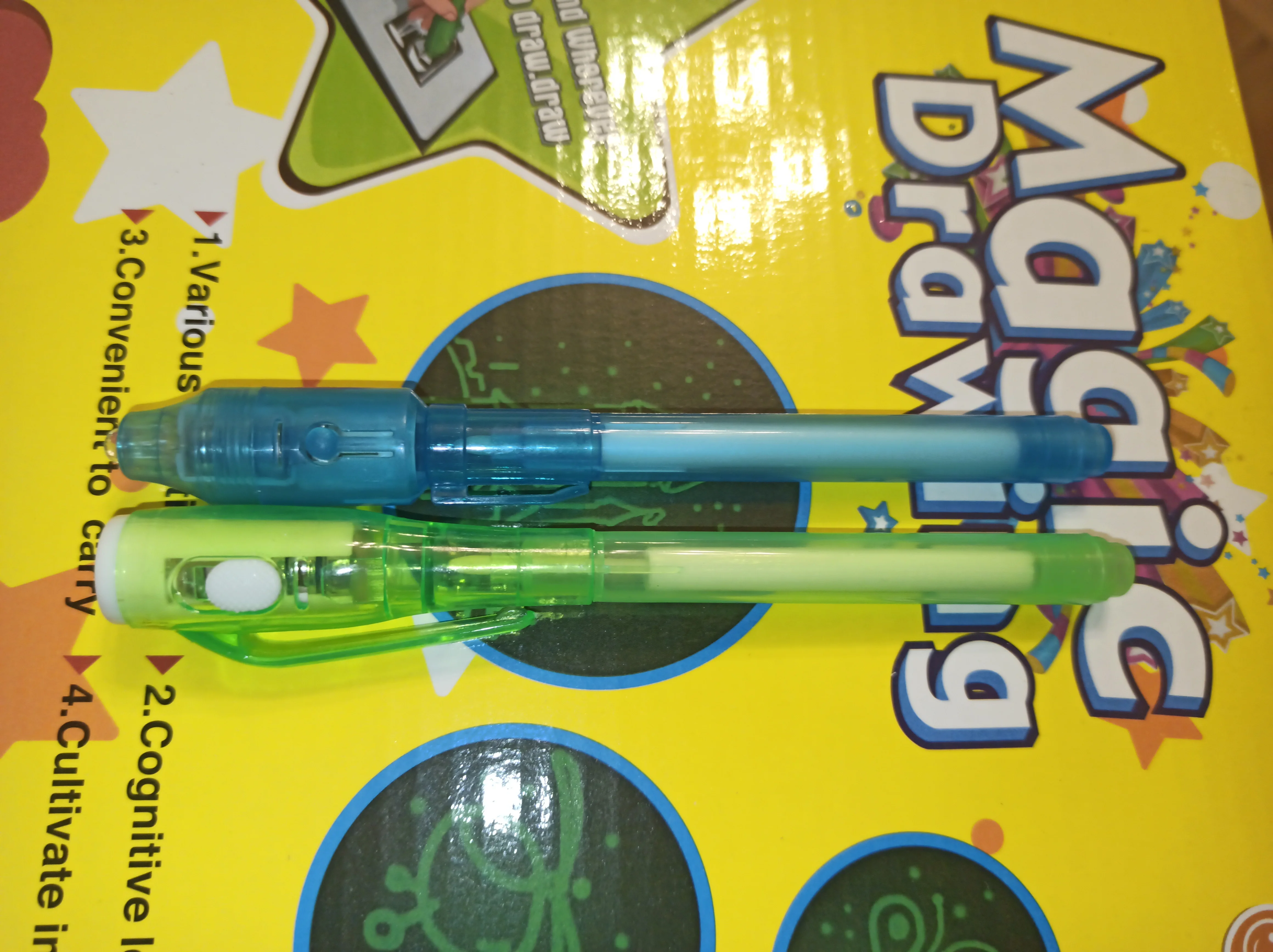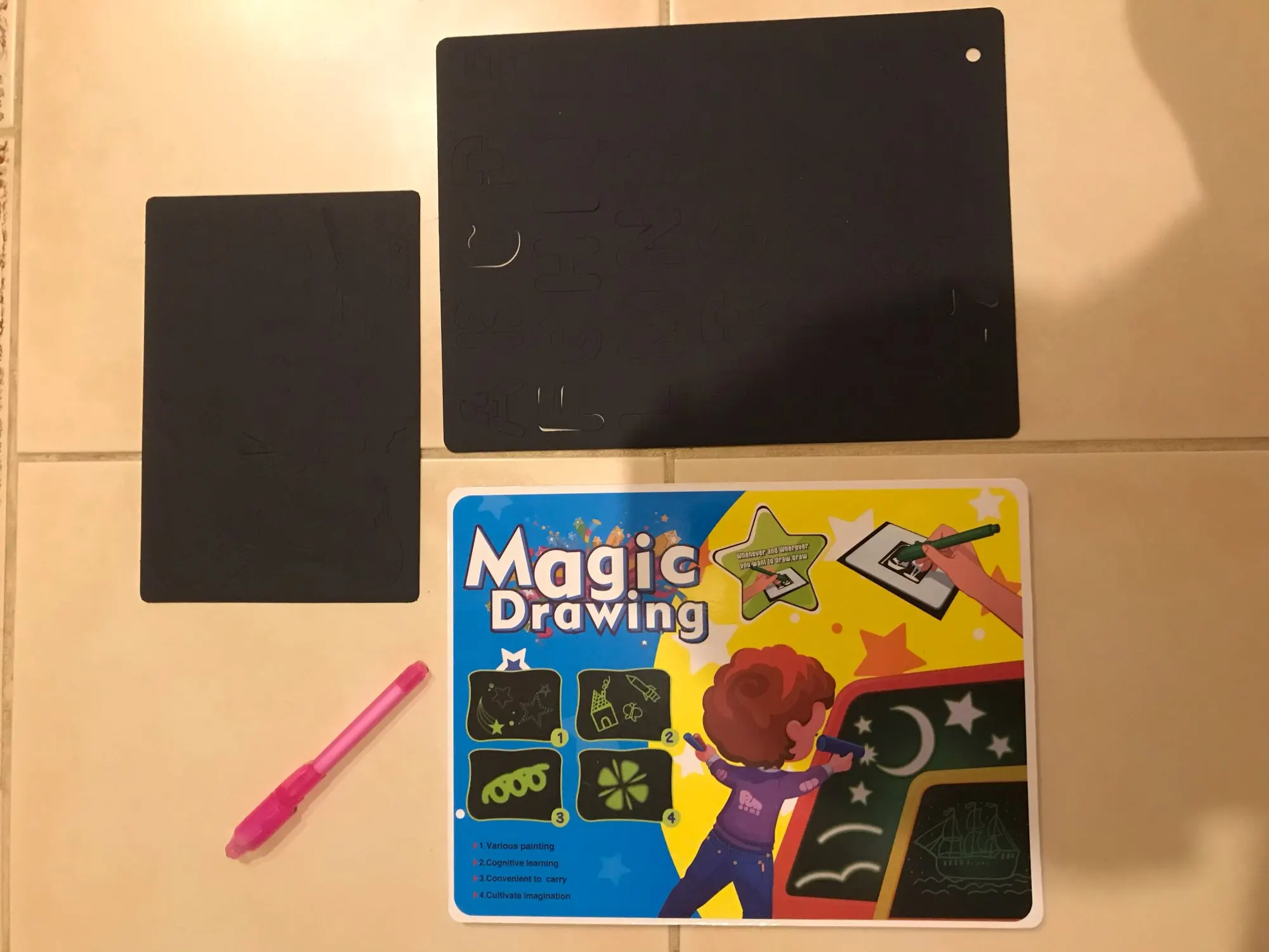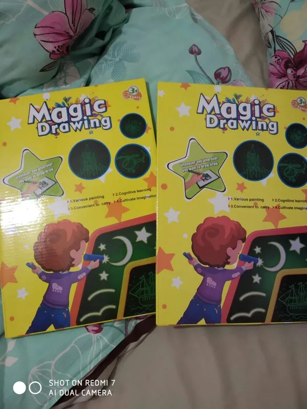 Написано AliExpress Standard Shipping 27 дней, по факту более 100. Уже открыл спор, но посылка пришла. Упаковано хорошо, приехало без повреждений. Сама доска то ли кусок пенопласта, то ли картона. Одна сторона чувствительна к свету диода, другая просто картинка. Ручка в комплекте не имеет переключателя. Чтобы загорелась лампочка надо с усилием нажимать на контакт, что не комфортно даже взрослому, не говоря о детях. Хорошо, что заказал дополнительно ручки с переключателем. Если бы увидел перед покупкой, не купил бы за эти деньги. Но детям понравилось «рисовать фонариком».