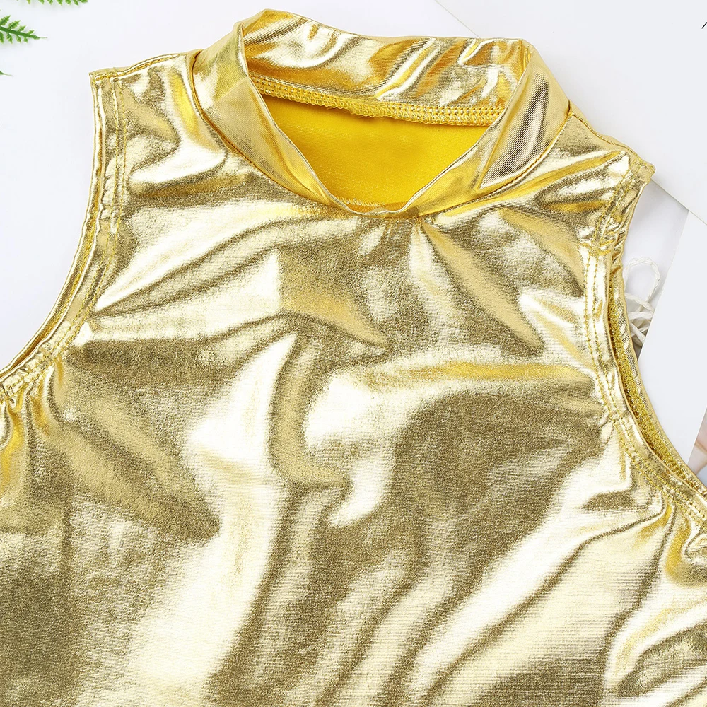 Балетные трико для девочек, балерина, металлик, без рукавов, водолазка, укороченные топы для балерины, танцевальные костюмы, сценические выступления